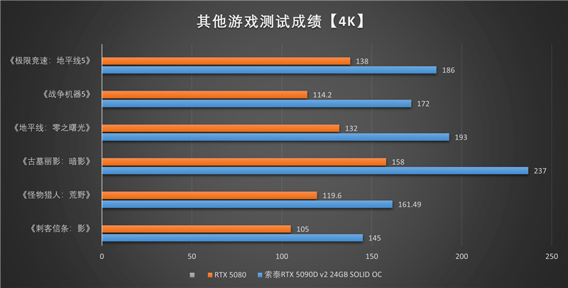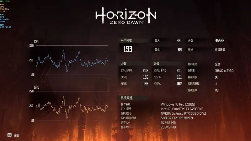 在《地平线:零之曙光》中,使用4K分辨率和终极质量画质进行测试,平均帧率为193。