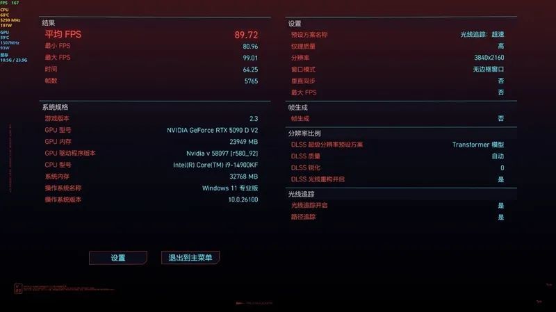 在《赛博朋克:2077》中,我们使用“光线追踪:超速”预设,并在DLSS中选择Transformer模型,DLSS超分辨率使用默认的自动,再4K分辨率下,运行自带的性能测试。