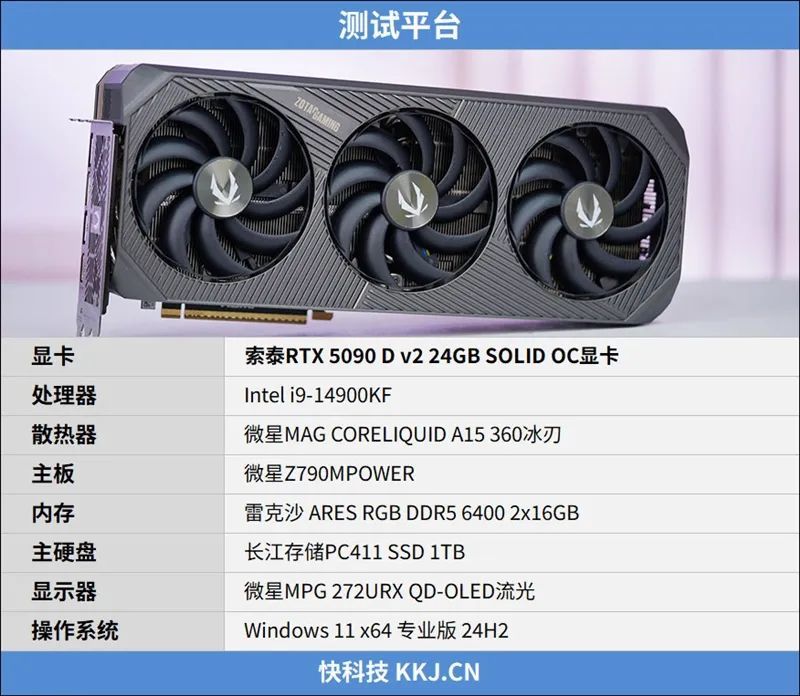 现在来到我们评测室的就是索泰RTX 5090 D v2 24GB SOLID OC显卡,新版的旗舰和之前相比完全看不出区别,完全相同的外观和散热器尺寸配置,就让我们来看看它能否接替前任,坐稳显卡性能王座。
