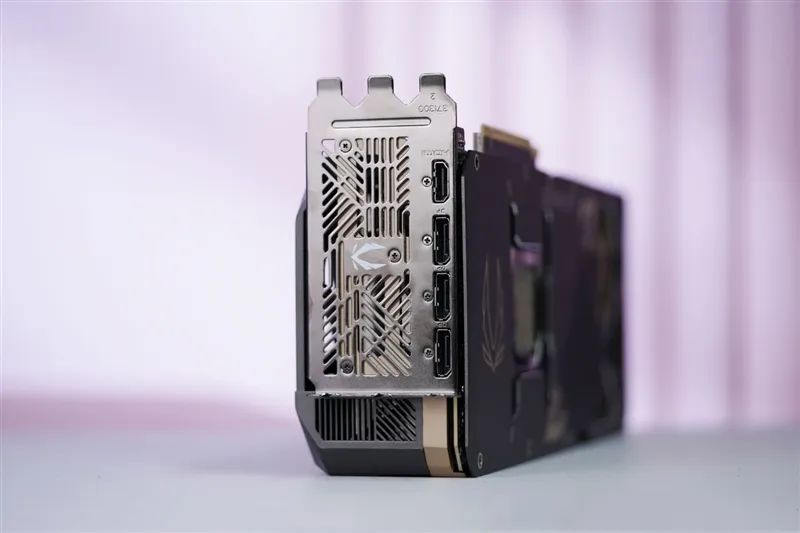 索泰RTX 5090 D v2 24GB SOLID OC显卡的挡板,设计有大量的散热镂空,显示接口方面提供了三个DP 2.1b接口和一个HDMI 2.1b接口。