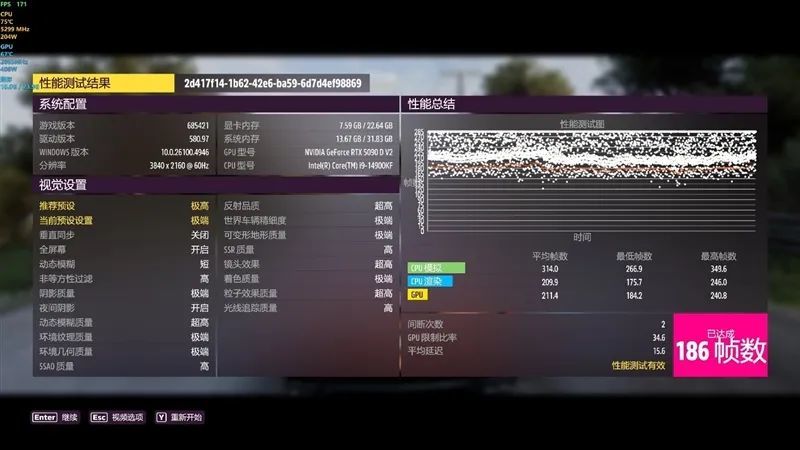 在极限竞速:地平线5中,使用4K分辨率极端画质测试,最终测试成绩为186fps。