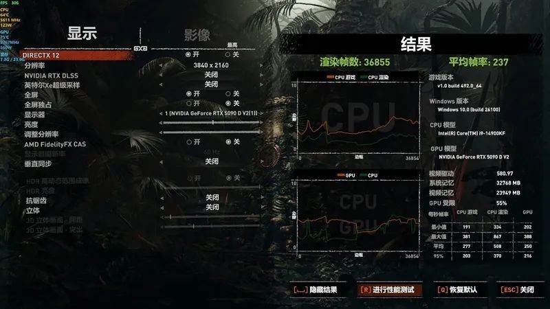 在《古墓丽影:暗影》中,使用4K分辨率和最高画质进行测试,DLSS超级采样设置为质量,平均帧率为237。