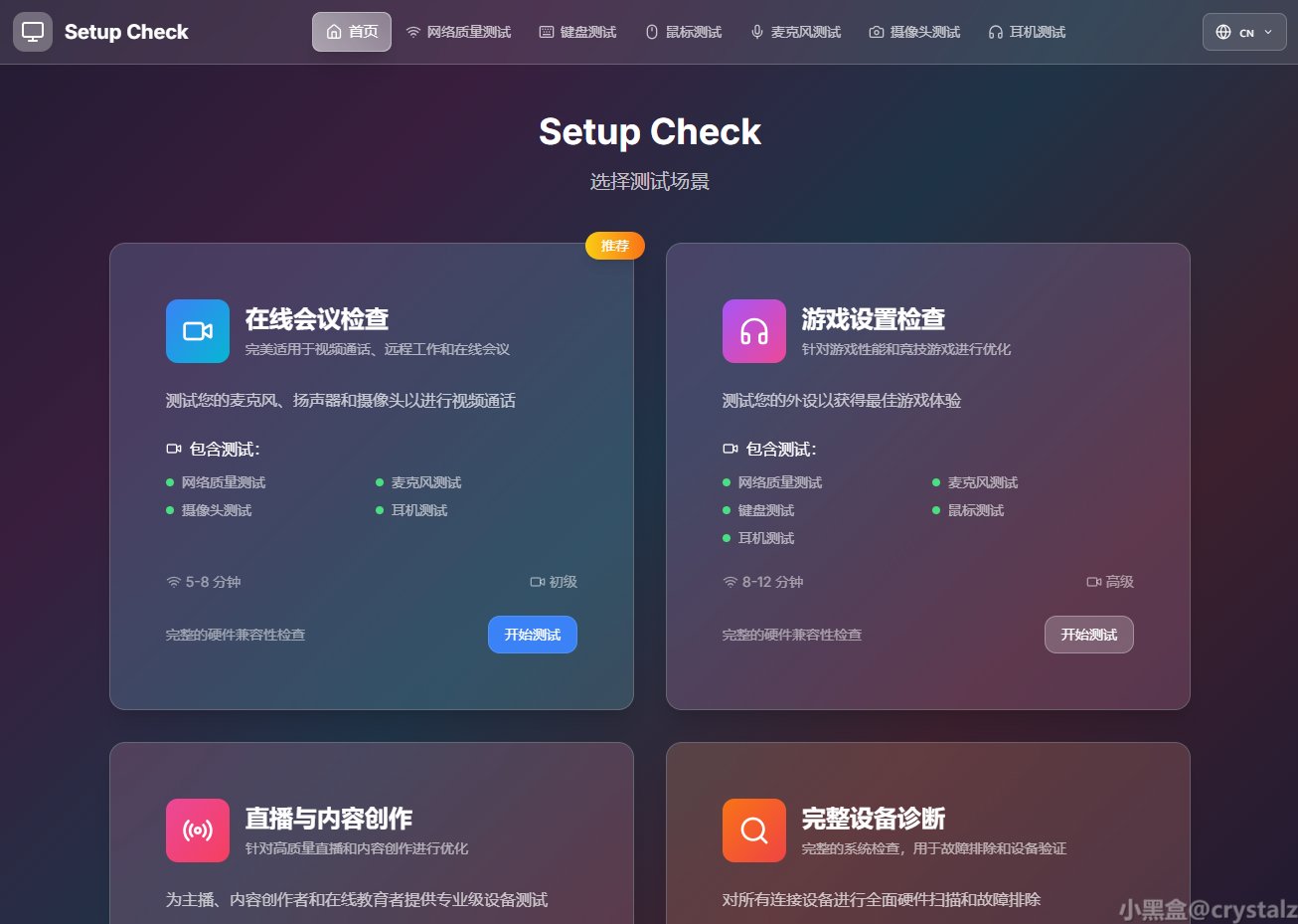 而且内置了多种实用场景,在线会议检测、游戏设置检测、直播检测、完整设备诊断等,非常方便实用。