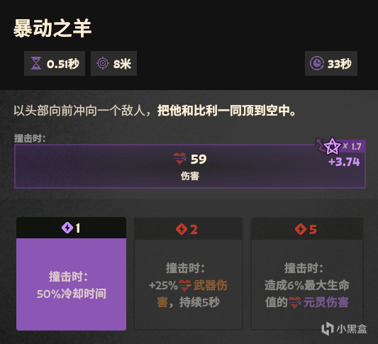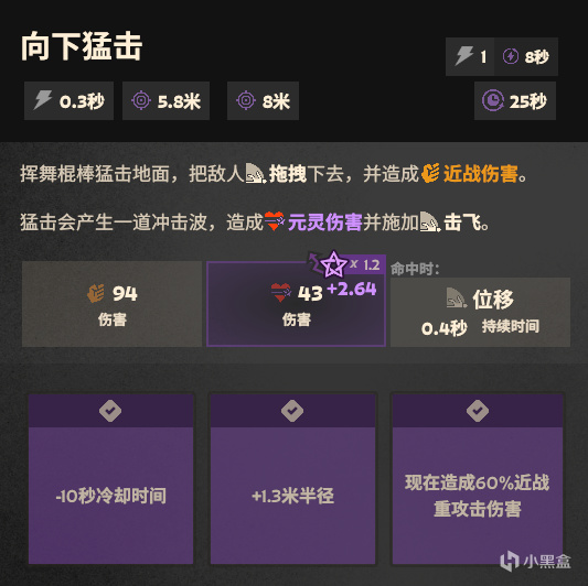 升级效果:-10s 冷却时间 / +1.3m 范围 / 改为造成60%重近战伤害