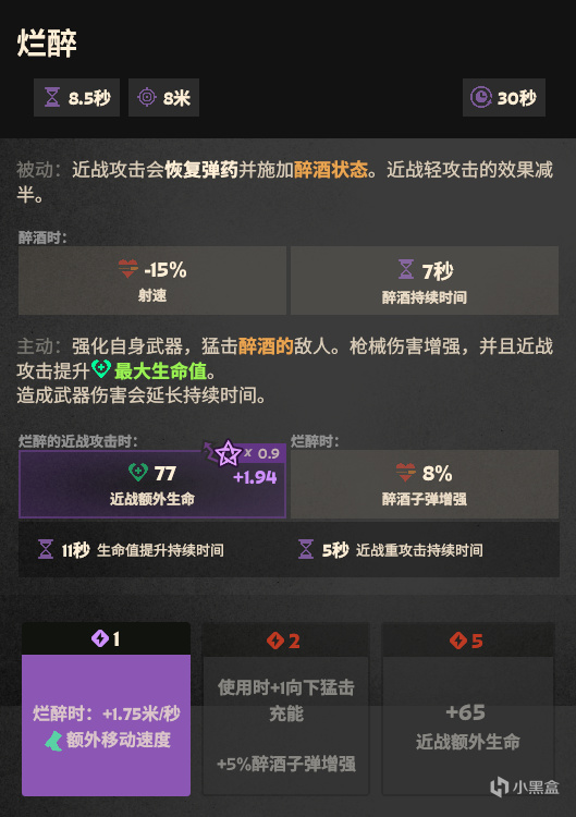 升级效果:当主动效果激活时:+1.75m/s 额外移速 / 使用该技能时还会恢复一次一技能充能数 / +65 近战命中时提升的最大生命值