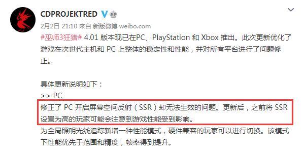 其實遊戲變卡的原因在更新公告裏就有提及。此前PC版遊戲中存在屏幕空間反射不生效的問題,開了和沒開一樣。由於該功能特別喫顯卡,因此在修復生效後會很影響遊戲性能,幀率自然會大幅降低。
