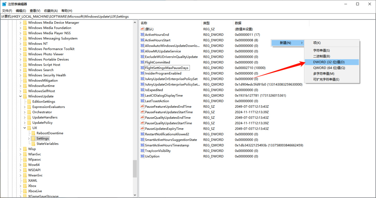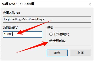 在桌面使用快捷键Win+R打开运行框输入regedit后回车打开注册表编辑器,依次打开下面路径文件:HKEY_LOCAL_MACHINE——SOFTWARE——Microsoft——WindowsUpdate——UX——双击Settings——在空白处右键新建一项DWORD (32位)值——命名为FlightSettingsMaxPauseDays——基数选择十进制——数值数据处填写10000。