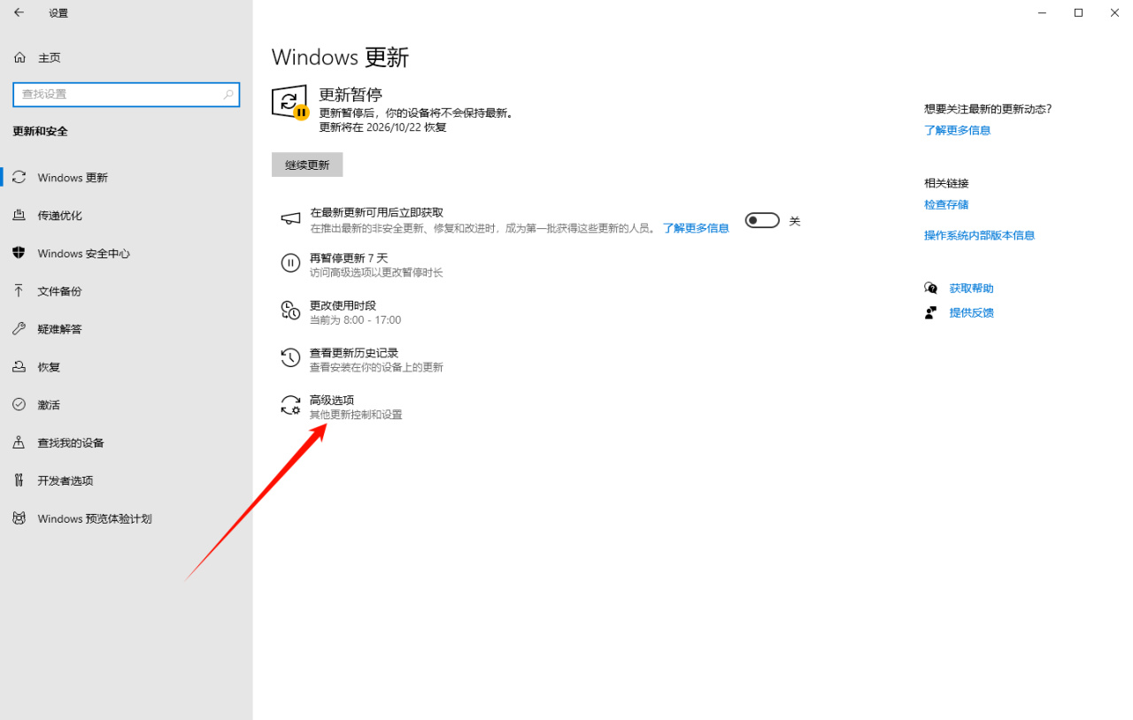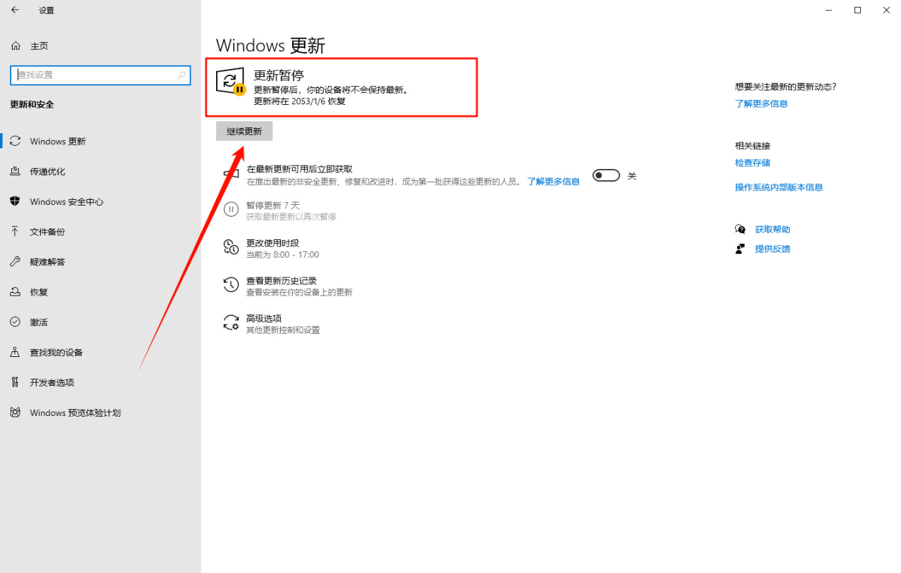 设置完成后打开设置修改暂停更新日期即可(Win10设置截图):