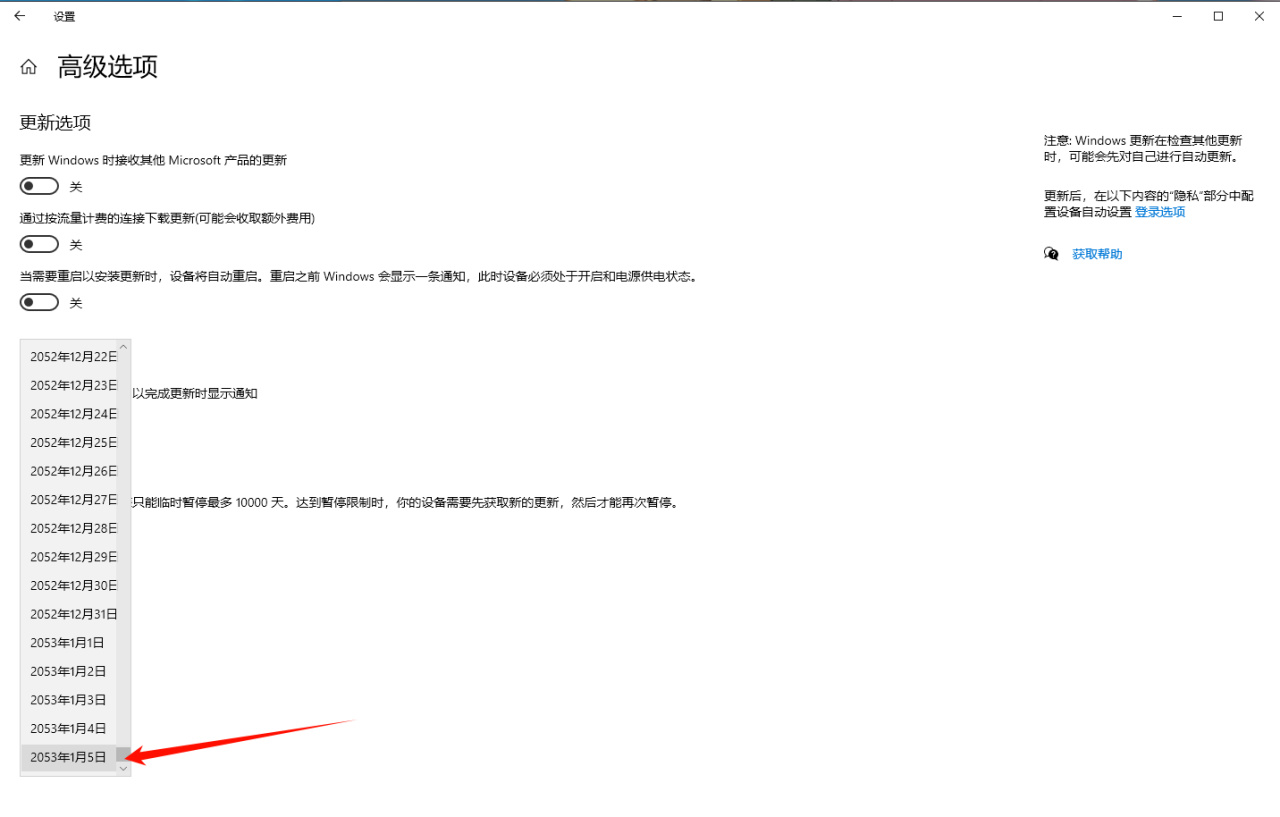 按照上述路径填写完成后可将系统更新推迟至2053年,下面是具体的路径截图: