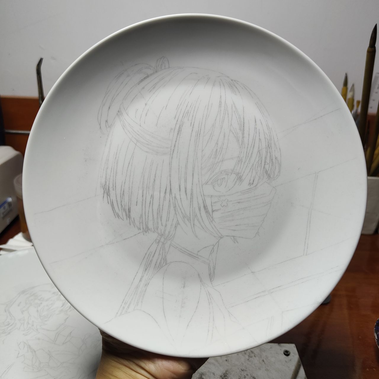 p1燒製完成的效果,應盒友要求降低了飽和度,p2是上完色還未燒製的效果,p3是勾完線稿的樣子,p4是起完鉛筆稿。