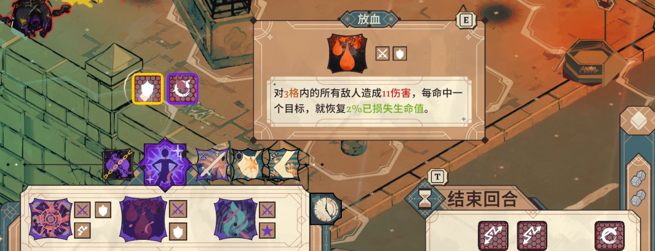 比方說,“放血”這個技能,需要一個攻擊印記和一個防禦印記組合在一起就能觸發,可以同時攻擊到範圍內的全部敵人,還能回覆自身的已損生命值,突出一個攻擊就是最好的防守。