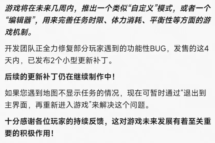 在未來開發團隊會修復各種bug,還會用“自定義”的功能來完善任務時限、體力消耗以及平衡性這些問題,我想說這個態度還是很不錯的,如果能修改好,另外把遊戲內容再豐富一下,那麼好評率衝到90%以上,應該也不是問題。