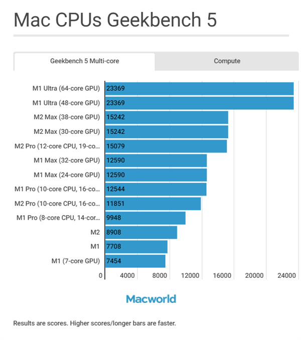 Mac处理器Geekbench 5多核跑分对比: