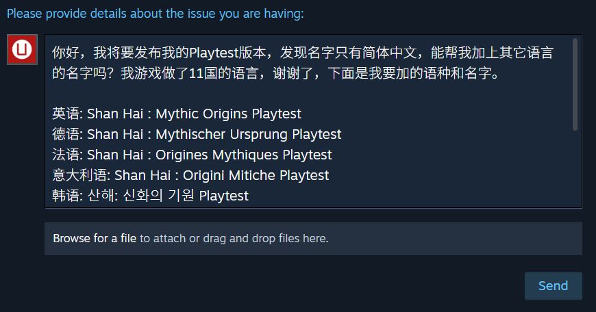 我們遊戲的Playtest最早在Steam上只設置了中文,但是隨着遊戲的製作我們想要給製作成標準的11種語言,然後發現一個大問題,測試版不支持再設置任何語言了。這可讓我們頭大了。