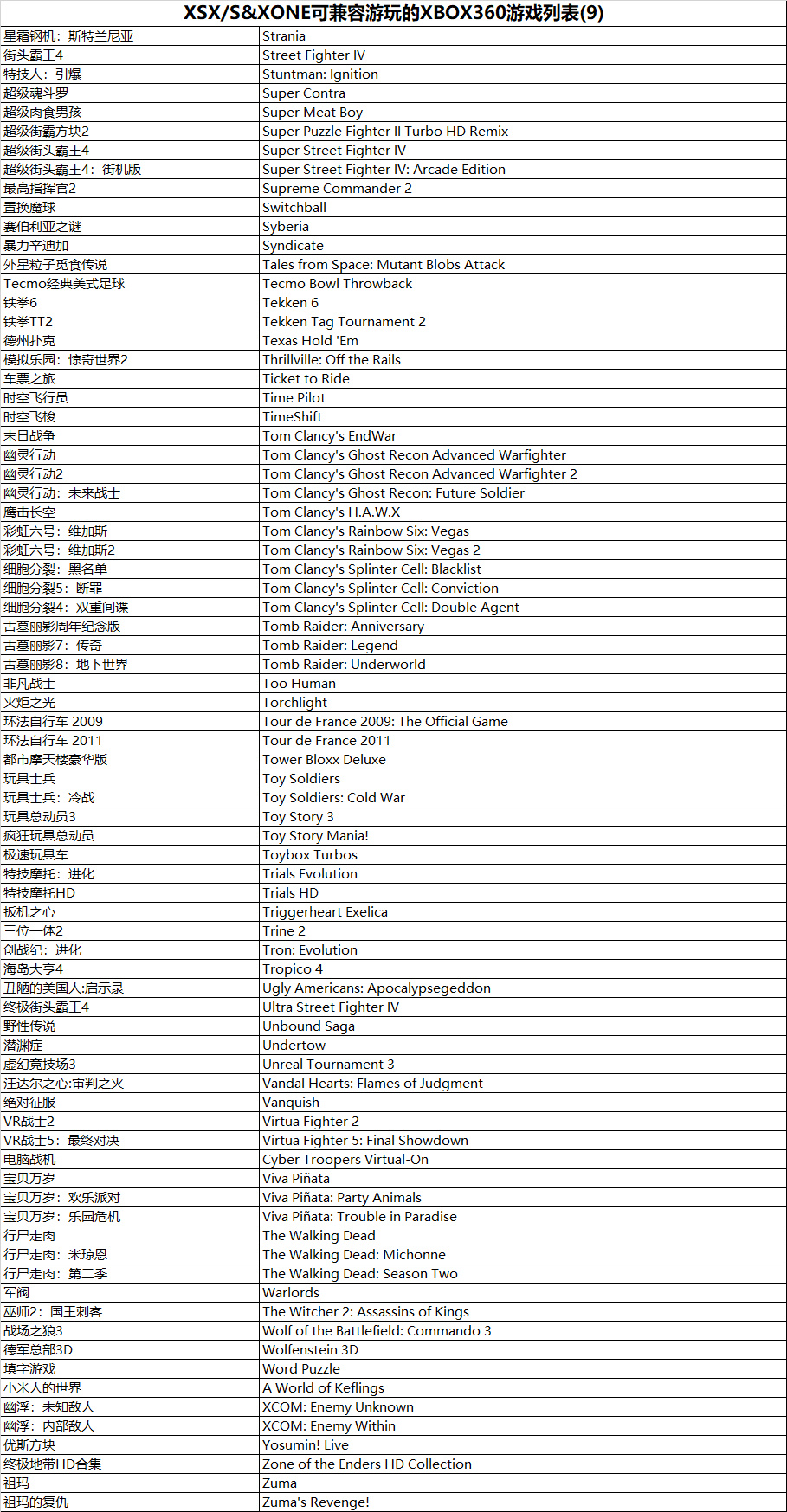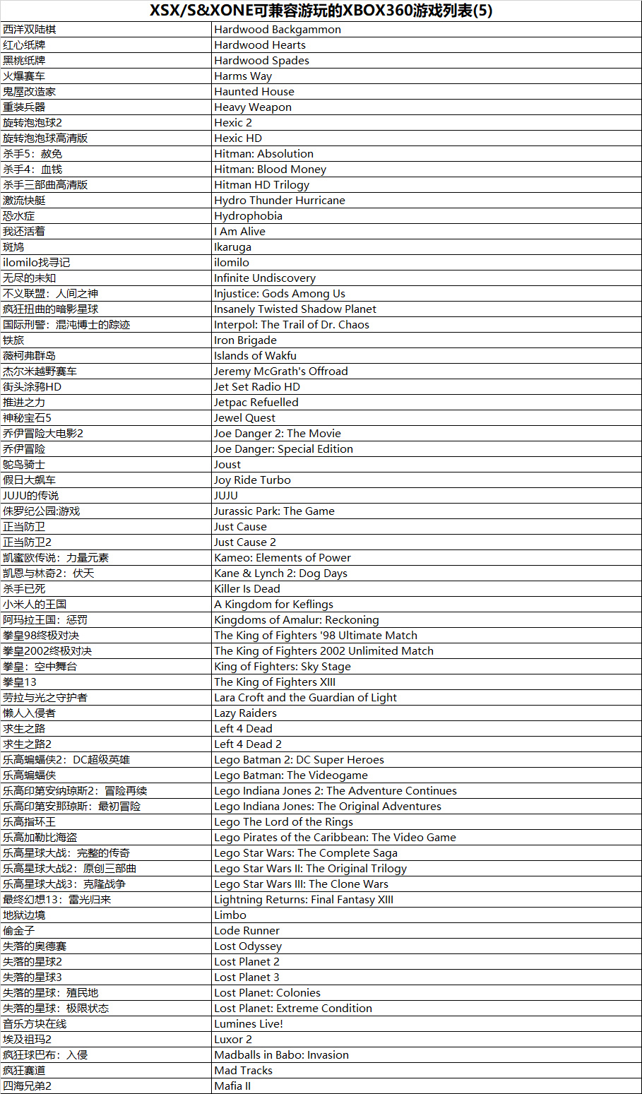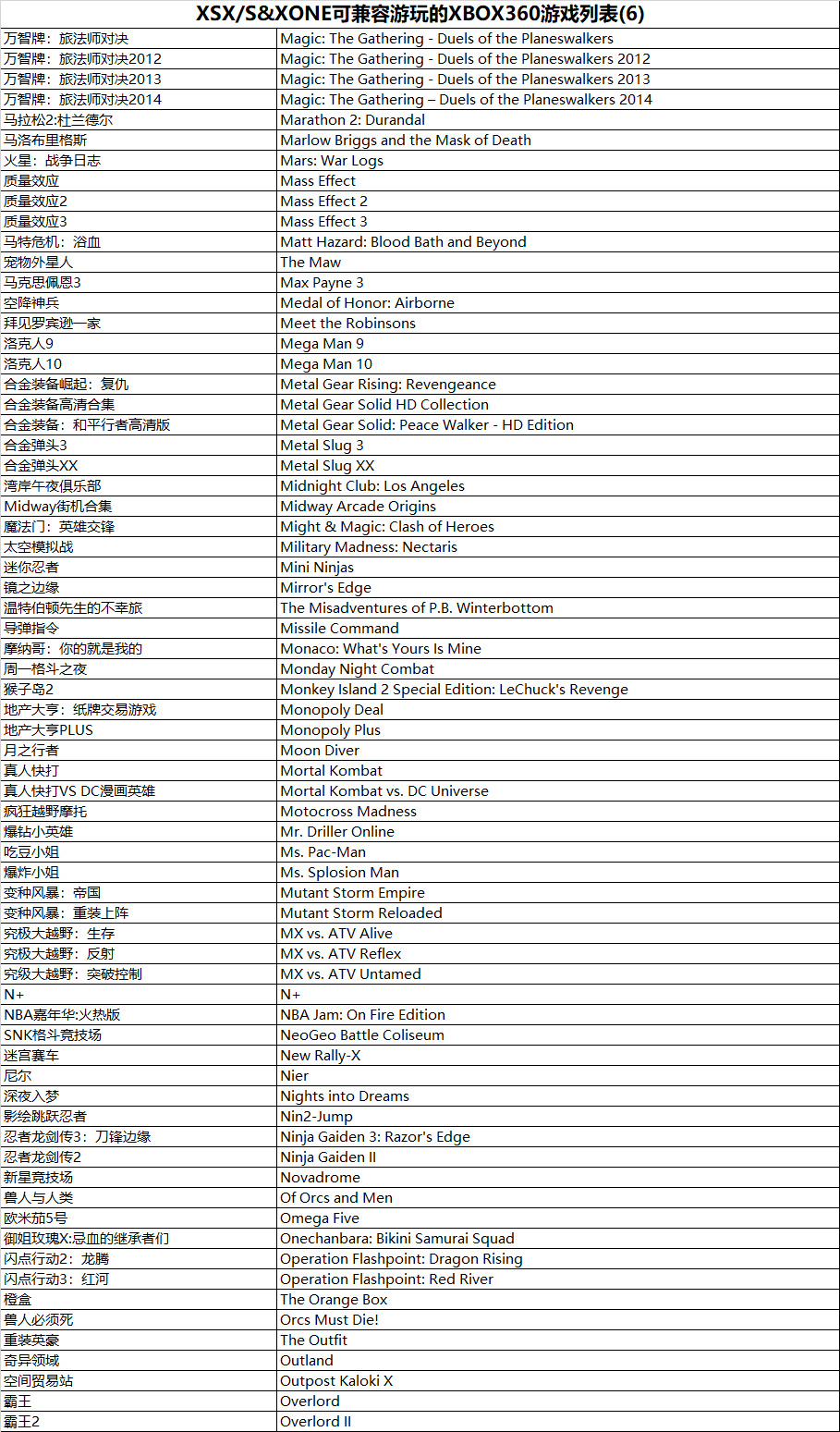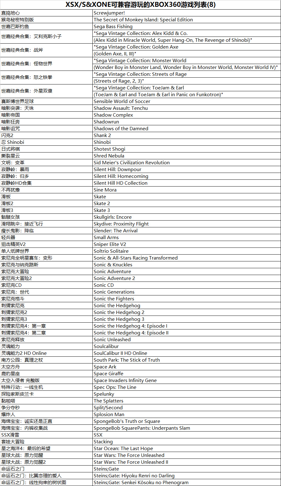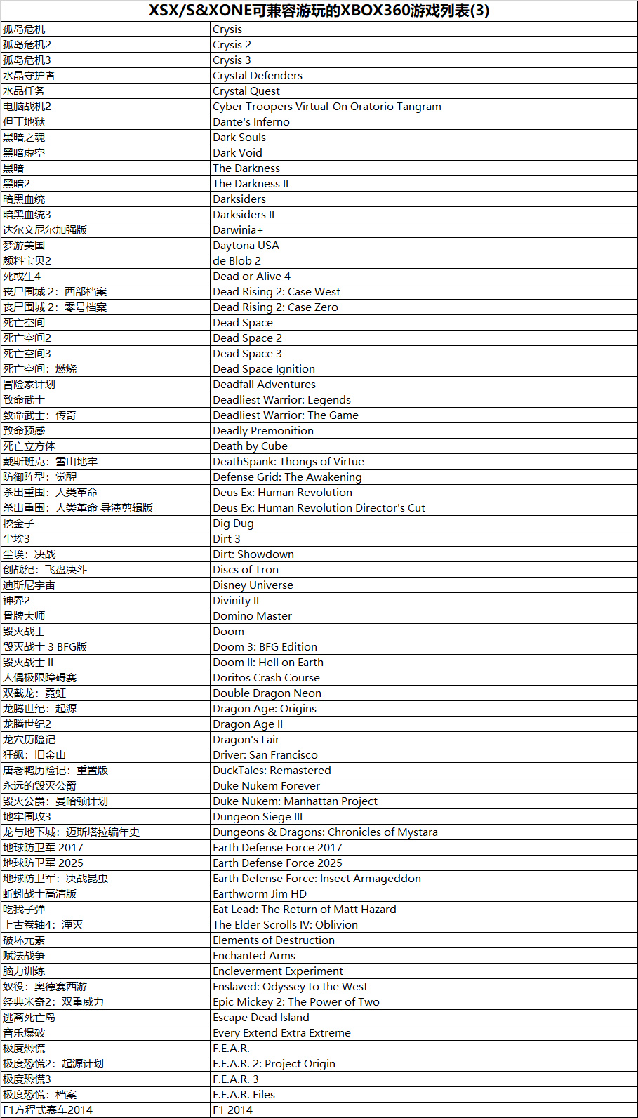 终于整理完了最大的列表,XSX,XBOXONE兼容XBOX360的游戏列表,我整理了中英对照一共分成了9张图,分享给大家。 标题虽然写的是XSX,但XSS也可以通过XGP或者数字版玩兼容的360游戏,只不过没光驱没办法玩光盘版游戏。XSX,XBOXONE的兼容方案是通过读取光盘的验证内容,通过网络下载数字版,并不是直接读取光盘内容,所以只要是光盘验证那部分没有损坏,就可以成功读盘下载兼容版本,所以如果光盘在360上已经无法读取,很大概率可以通过XSX,XBOXONE读取成功。 之后我会补充一个XSX/XBOXONE有兼容增强的列表,像我之前玩的战争机器2和战争机器3的FPSBOOST非常有用,特别丝滑,但是这个FPSBOOST看起来默认是不开的,别忘了开启。