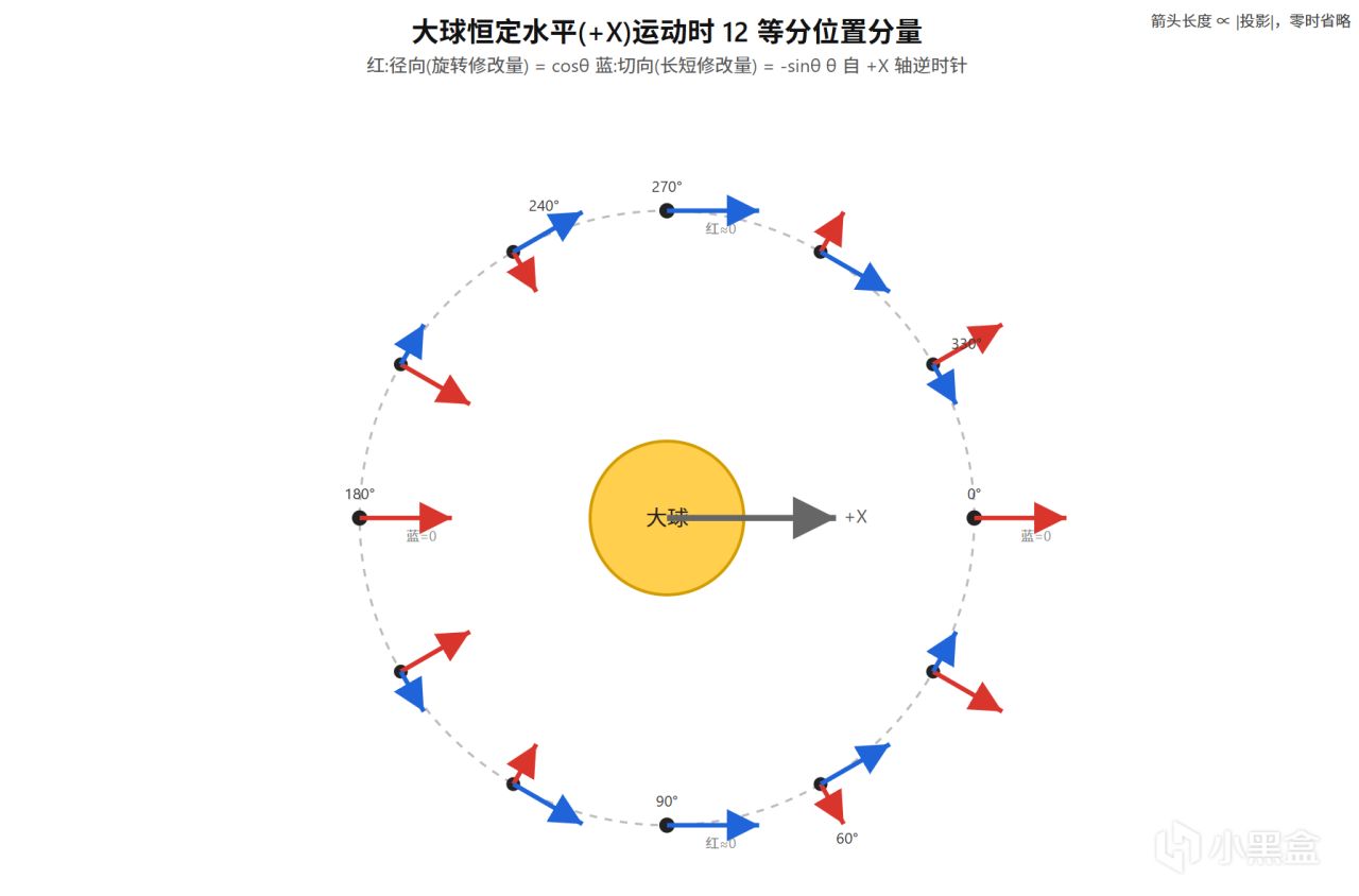 我(懒)让 AI 画了这张图,展示小球在轨道上不同位置时,你移动大球会分别带来两种作用:蓝色表示改变椭圆的长短(偏心/远地点距离),红色表示旋转椭圆长轴方向。交替利用它们,就能完成“远程瞄准”。