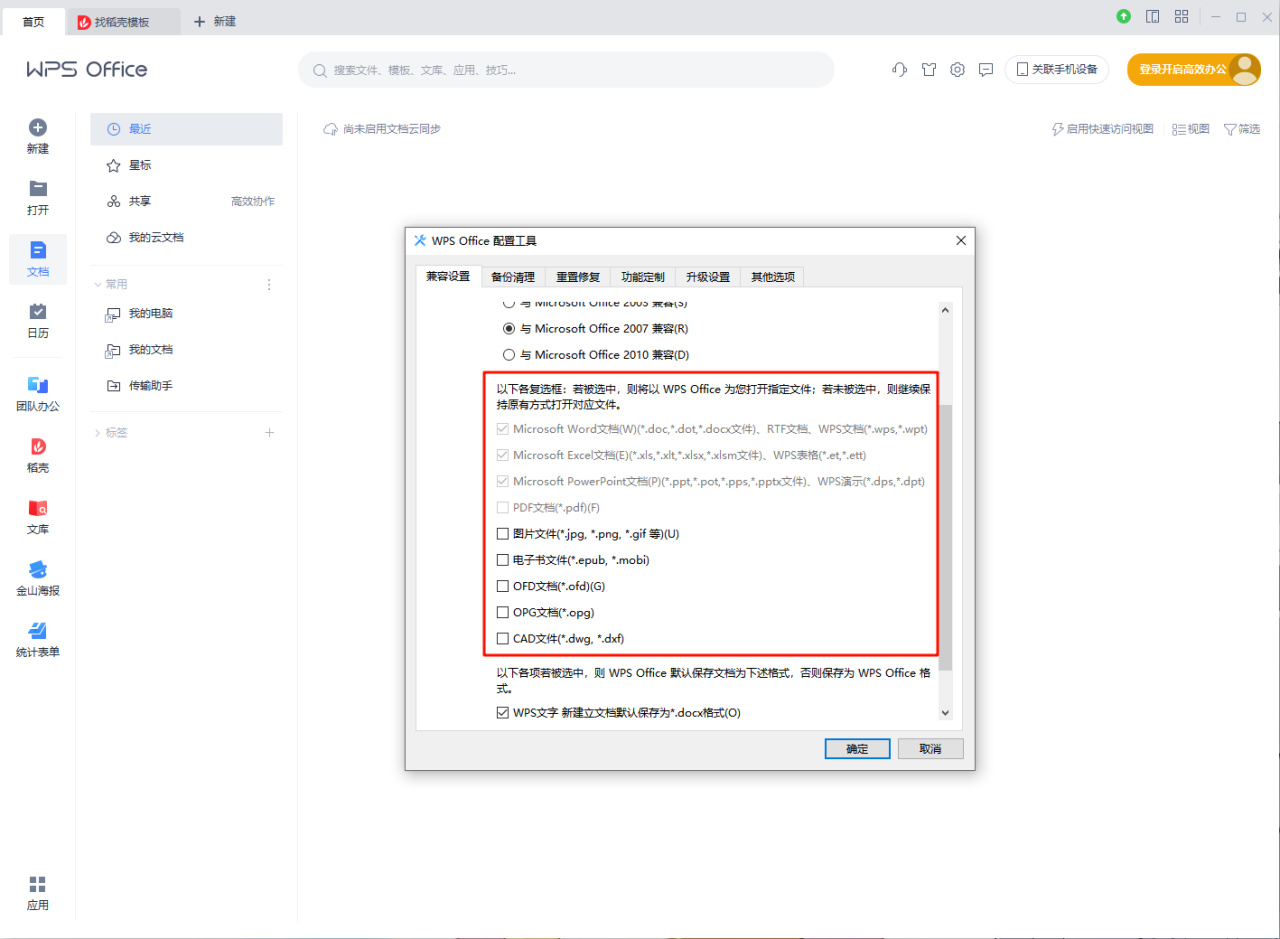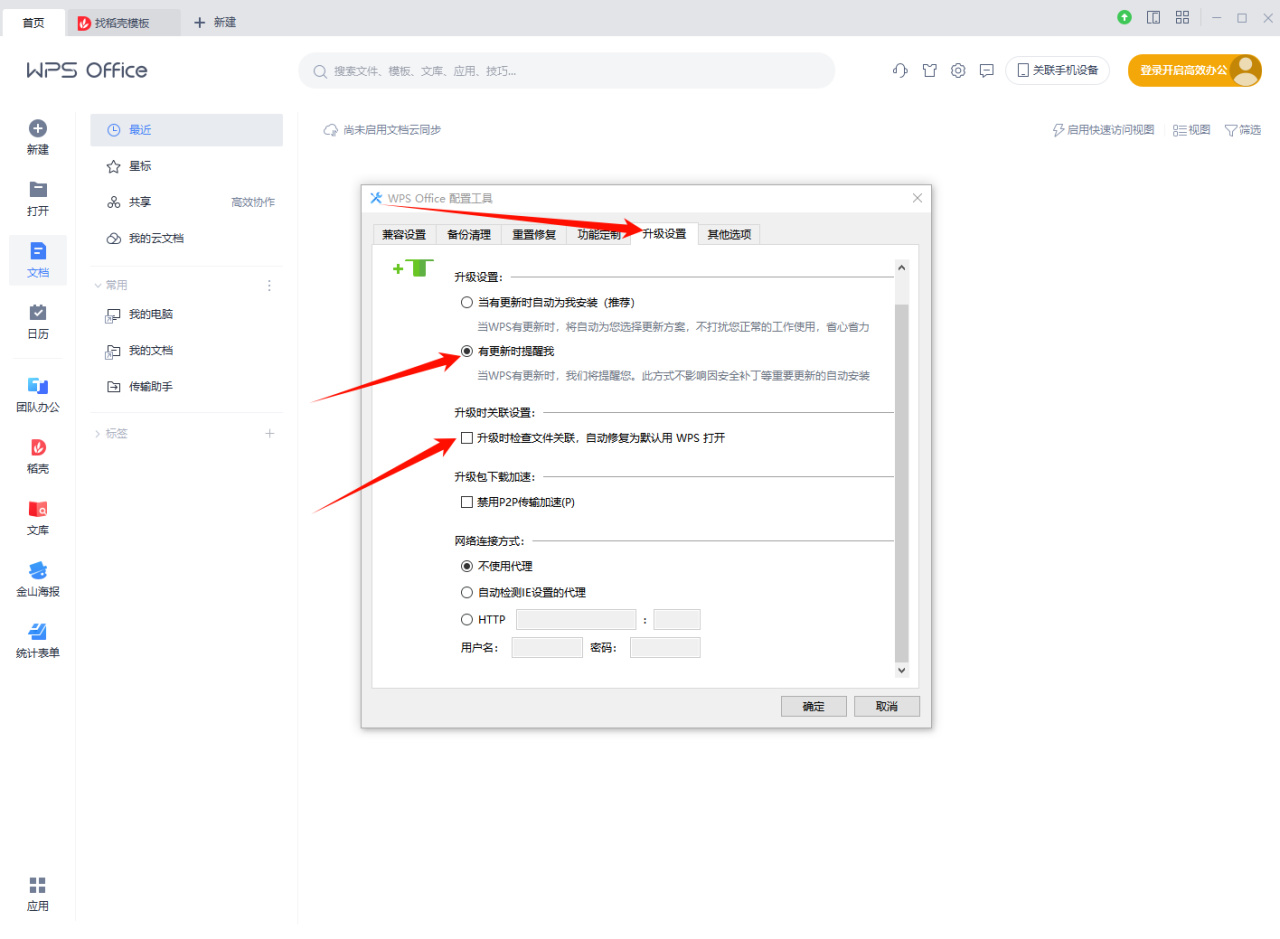 在“升級設置”中將升級設置修改爲“有升級時提醒我”,取消勾選“升級時檢查文件關聯,自動修復爲默認用 WPS 打開”。
