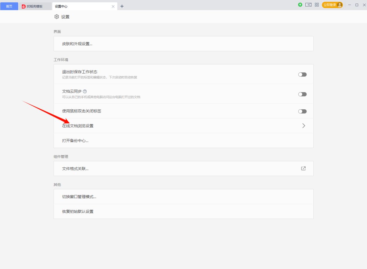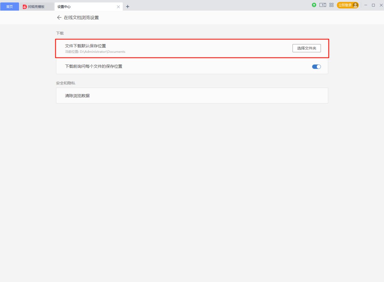 在“設置”界面選擇“在線文檔瀏覽設置”中修改文件下載默認保存位置爲其他盤符。