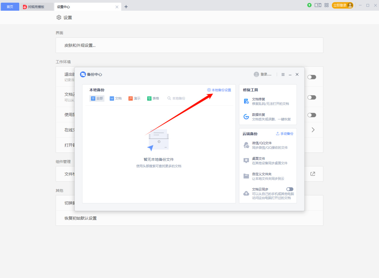 打開WPS,點擊右上角的齒輪,選擇“配置和修復工具”。