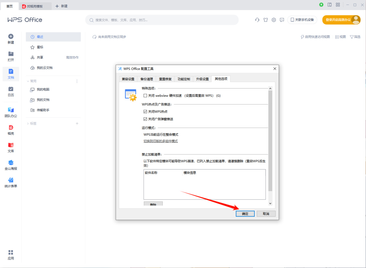 點擊“高級”,切換到“其他選項”,取消勾選“WPS熱點及廣告推送”。