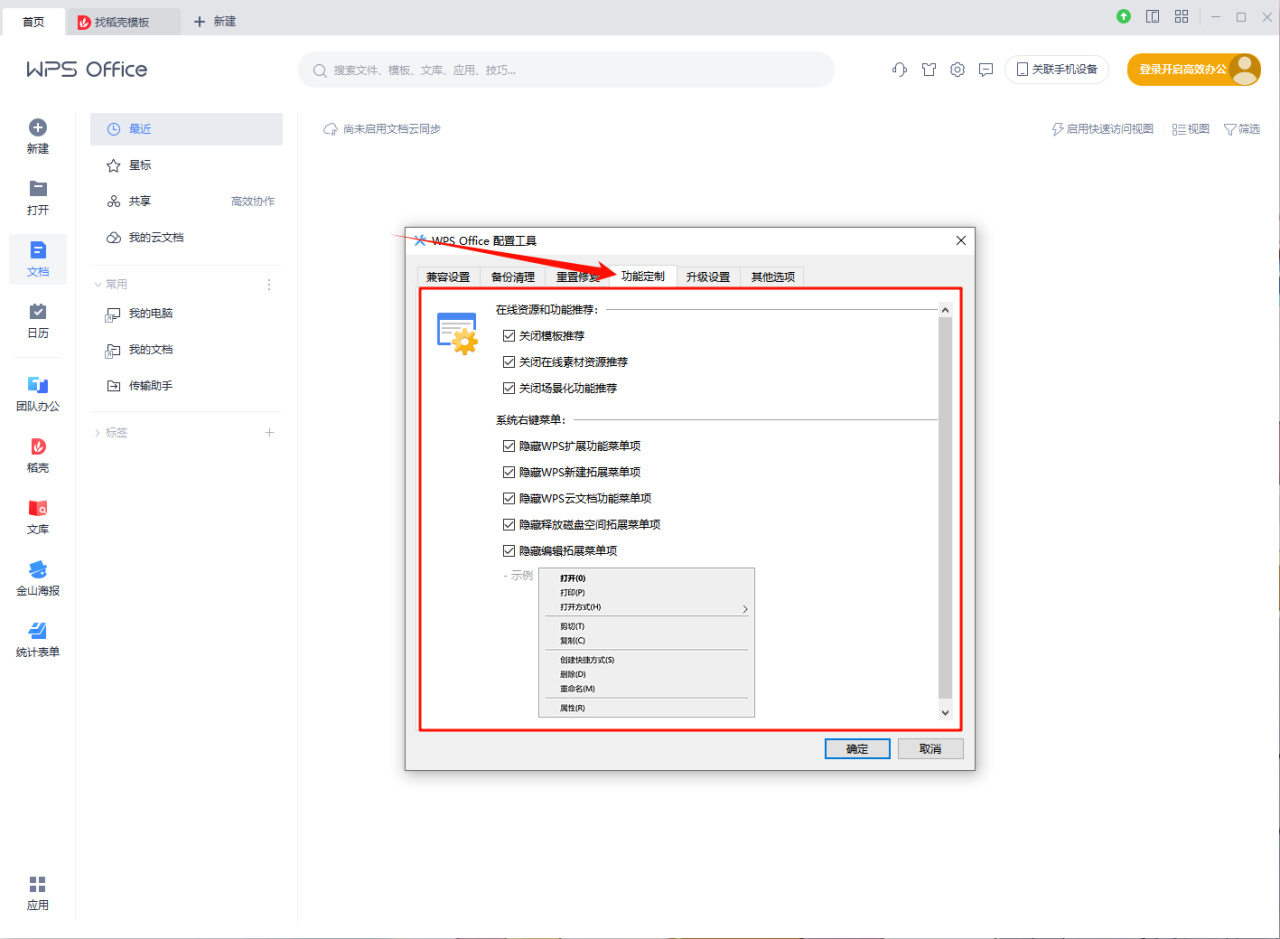 在“功能定製”選項卡中,關閉“模塊推薦”、“在線素材資源推薦”和“場景化功能推薦”,在這個頁面內還能關閉在桌面右鍵菜單內冗餘的WPS功能,簡化右鍵菜單。