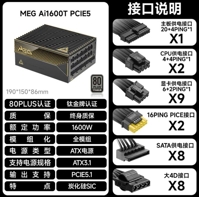 在PCDIY中,最不起眼的可能就是电源了吧?也可以说是在整机中最默默无闻工作的,况且还都是安装在机箱最底部角落被遮挡的配件。不过虽然如此,但是在我们整机运行中,其实首要考虑的应该就是PC电源了,它的稳定与否,直接关系到了整机所有配件是否能稳定运行的基础,也可以说是动力所在的心脏。今天要介绍的是一款默默无闻的顶级电源——来自微星的MEG系列 AI1600T PCIE5 超神电源,这颗电源是目前微星的顶级,其实放眼整个PC界也是相当无敌的存在,因为这颗电源拥有1600W的额定功率输出,ATX3.1 READY、PCIe5.1 READY 这些是必不可少的,而且还通过了三种不同的钛金认证,电源的规格配置方面也是相当的豪华。