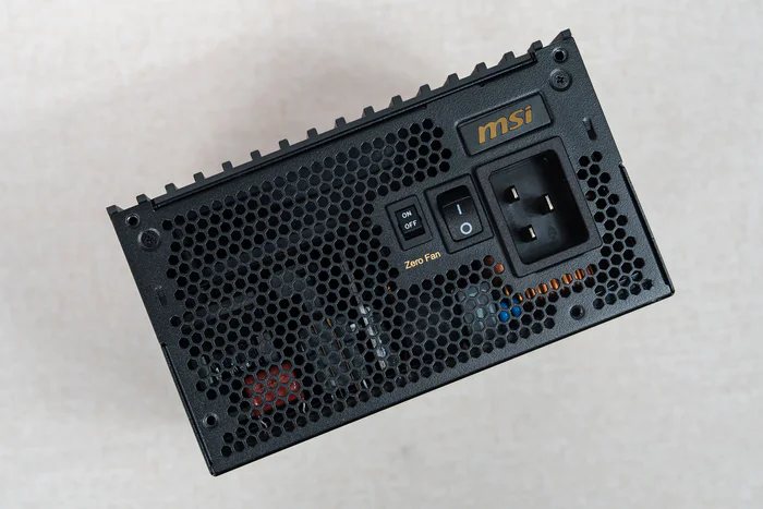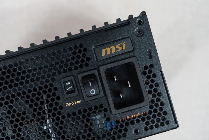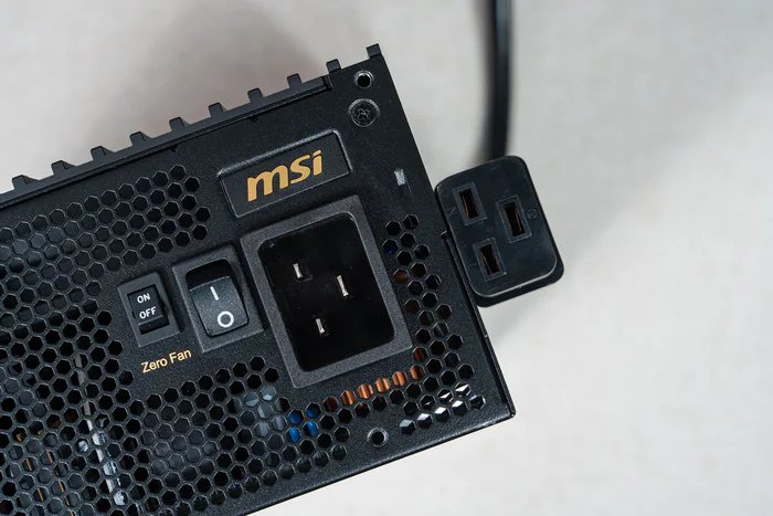 风扇支持 ZERO FAN 零停模式,并可在TDP低于55%时停止风扇运行,节能静音效果更好。右上角还有一个MSI的金字logo,另外由于该1600W电源通过了80PLUS认证所以使用的接口为C19需要注意
