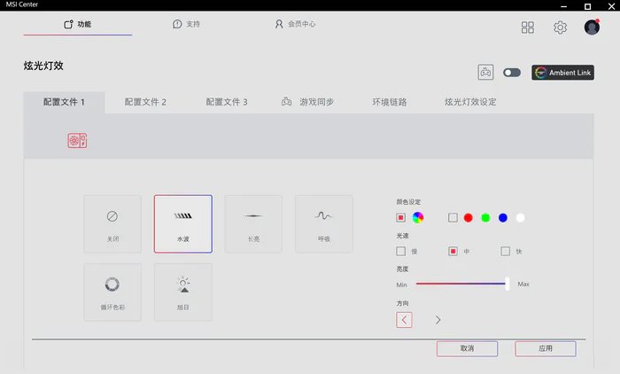 灯效控制也非常简单,只需要通过USB TYPE-C口连接至主机即可在电脑MSI CENTER软件中设置
