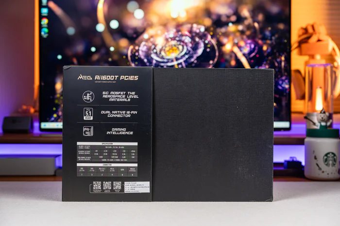 来看包装的背面,主要是三个特性:SiC MOSFET 碳化硅材料的应用、双 12V-2x6接口、微星G.I,下方则是1600W额定功率的分布以及线缆接口数量