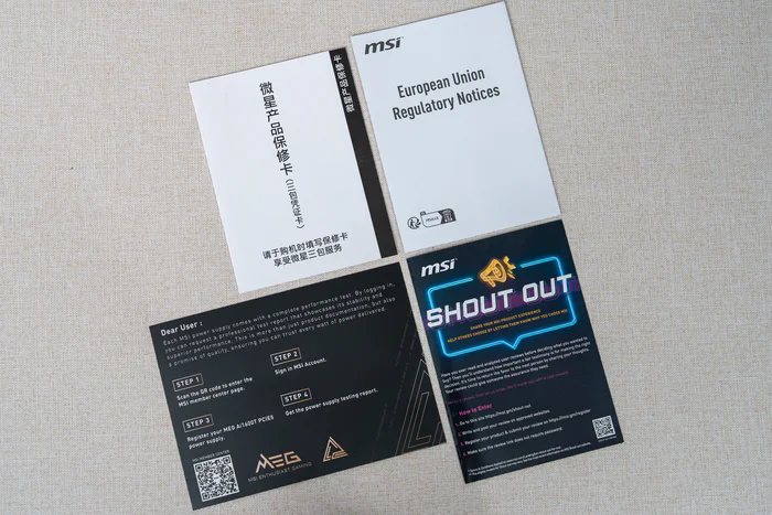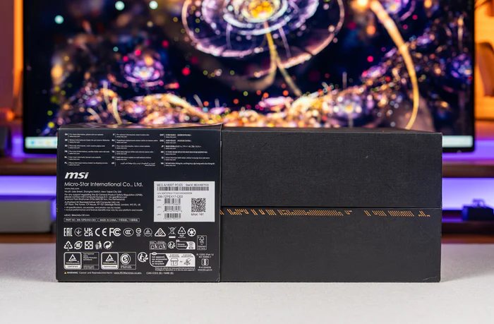 包装的底部则是多国语言说明、微星MSI的信息,以及产品型号序列号的标签,最下方的三排则是全球多国及欧盟等的认证信息,祖国的3C认证自然必不可少
