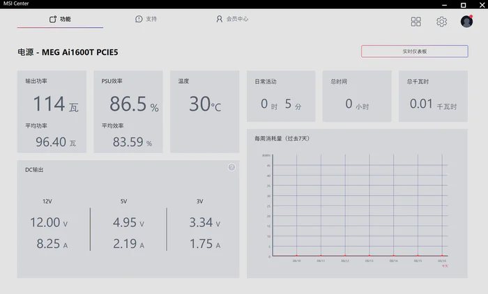另外AI1600T超神电源还是数字电源设计,所以在MSI CENTER中还能监控设备运行状态,不仅有电源的实时输出功率,还有平均功率,以及分别对应的转换效率,还有温度和各项电压的输出稳定性,以及运行总计等,具有非常直观的智能统计显示耗电量