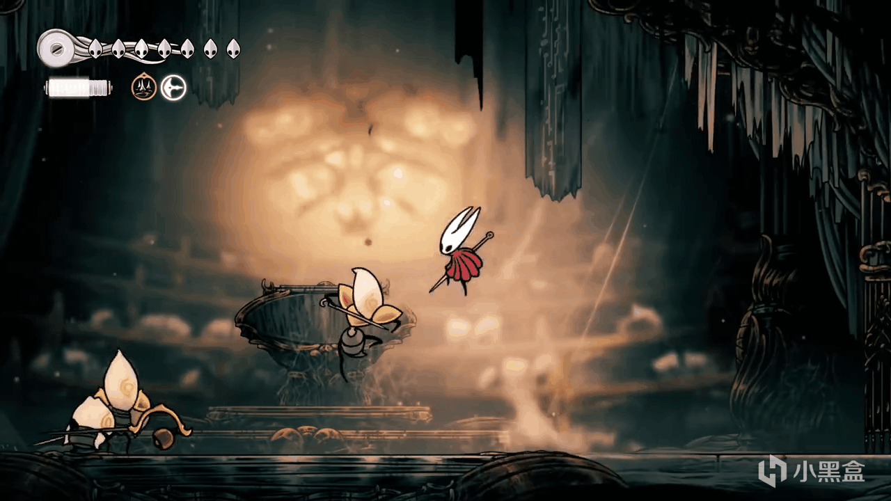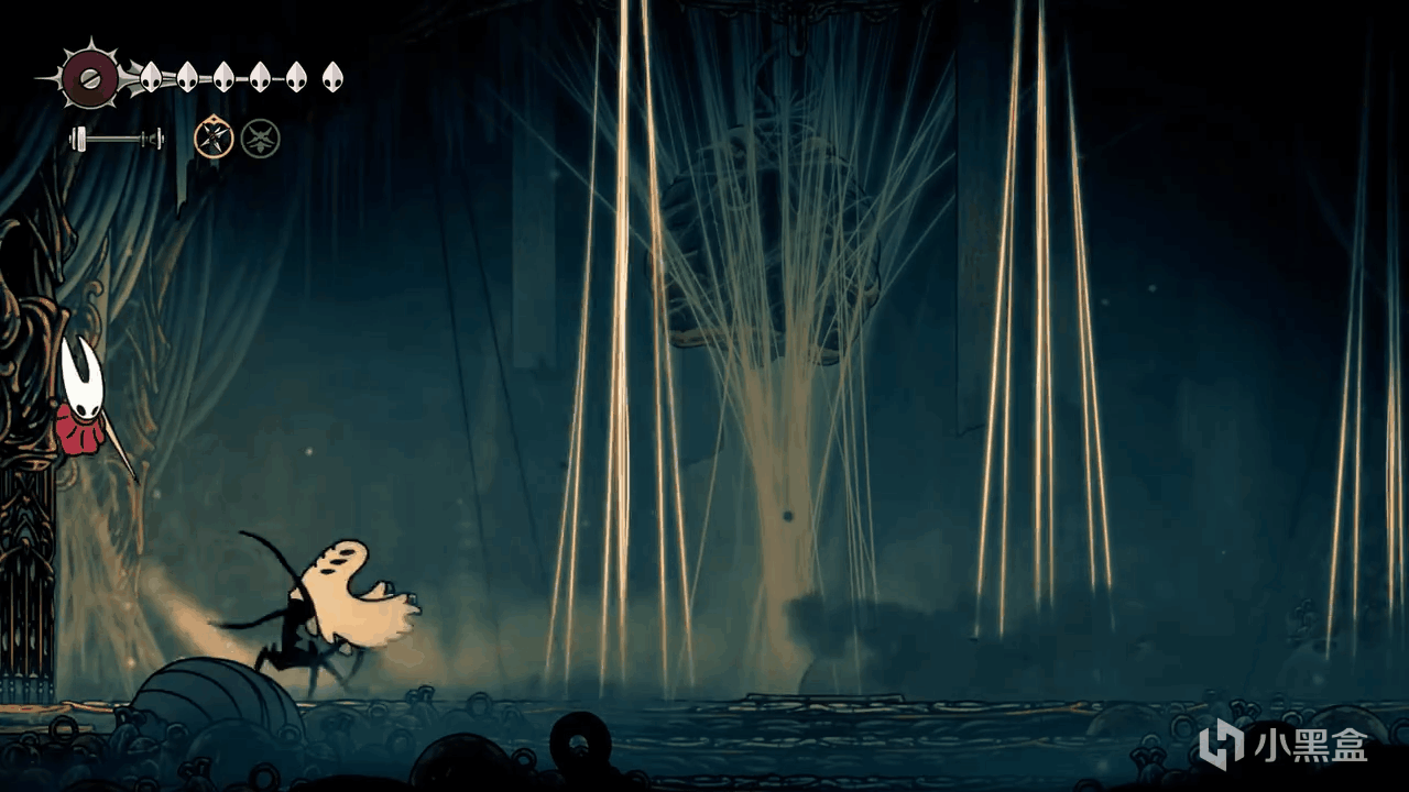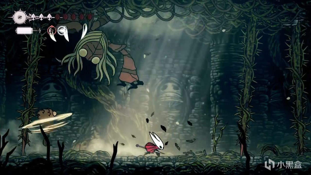 場景中的圓環是可以鉤住的,可以看到空中動作很豐富,旋轉跳躍+衝刺+下劈+後空翻,打得敵人像是空洞騎士王后驛站那個脖子很長的蟲子,所以絲之歌的時間線在空洞騎士之前?絲線槽應該是攻擊敵人會回覆,然後技能又不一樣了,魂槽UI倒是之前出現過,而且血量最左邊一格也不一樣,我懷疑是某種負面狀態,總不能像以撒一樣有骨心吧。