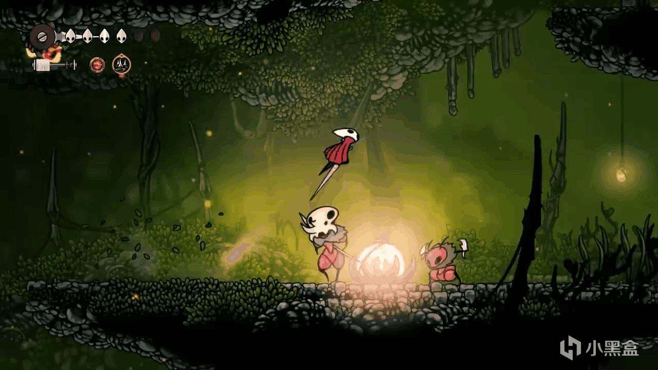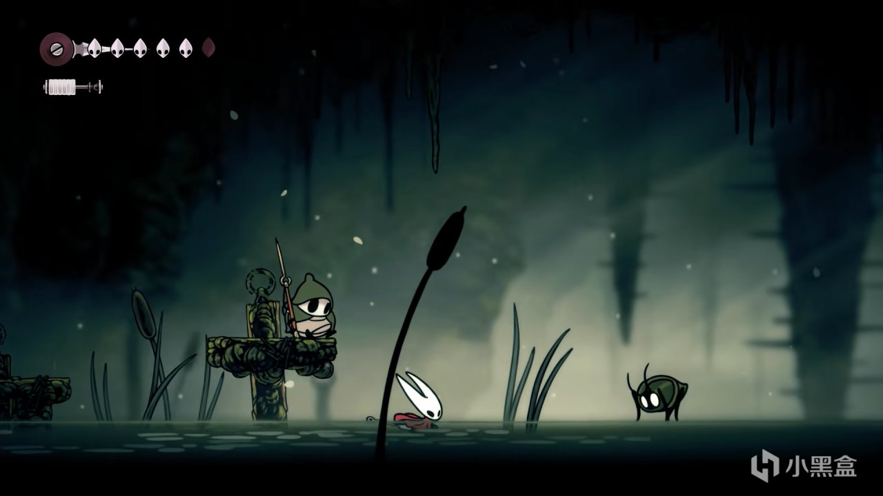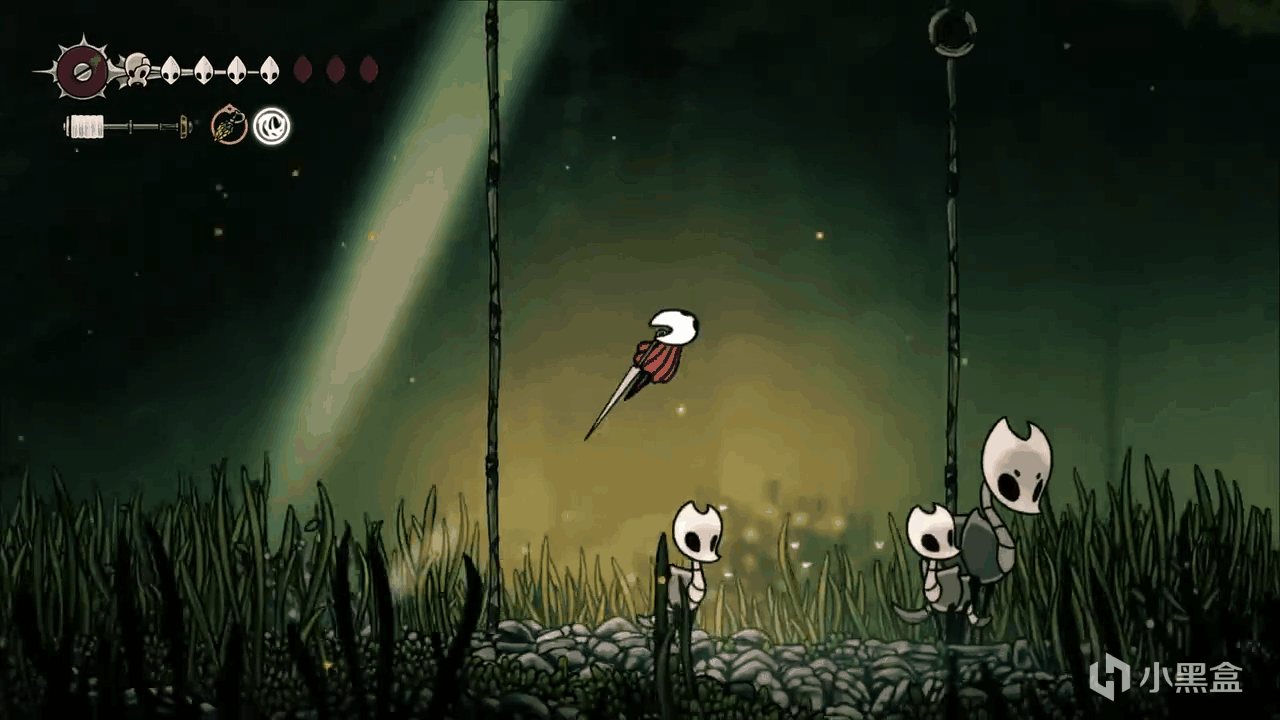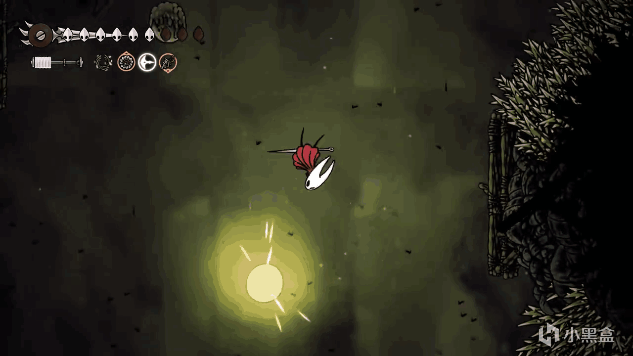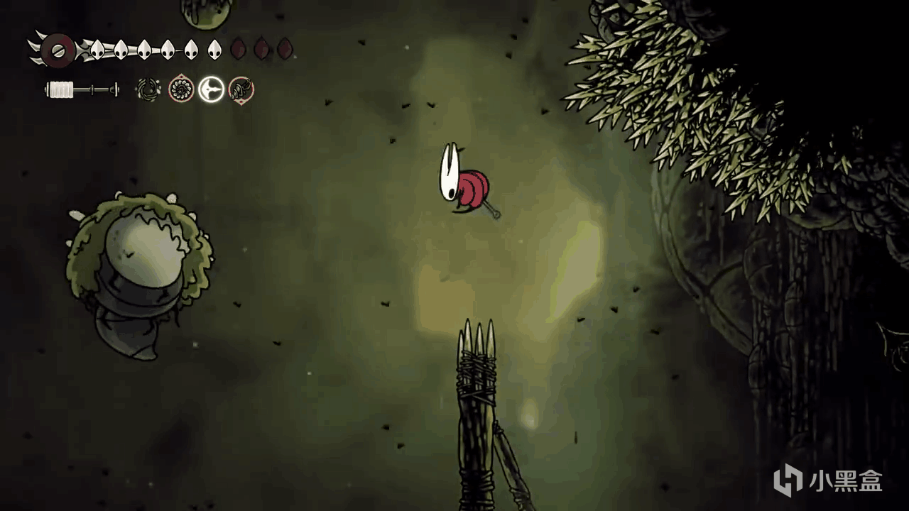 到下一個場景的過渡區域,可以看到地上的苔蘚以及草的種類是一樣的,走過去有很多小飛蟲飛過的動畫,也是第一次露出UI,有5滴血,前面的應該是低級地圖,很可能初始就有五滴血,跟空洞騎士是一樣的,但是魂槽變得不一樣了,魂槽下方還多了一條絲線值。