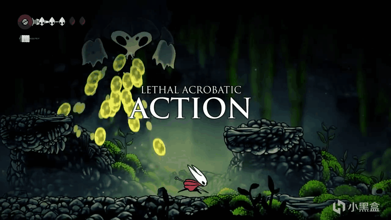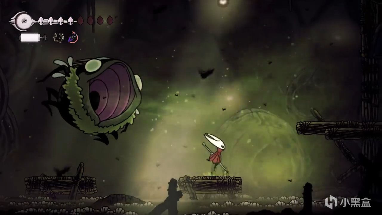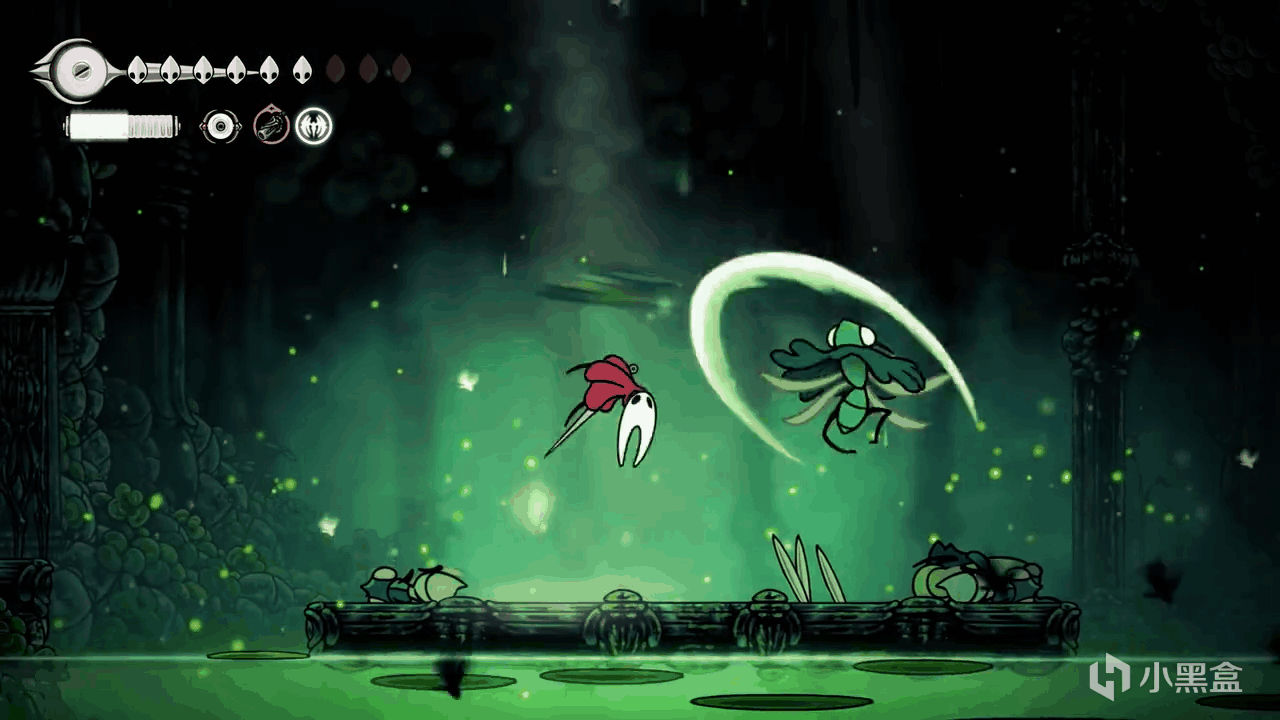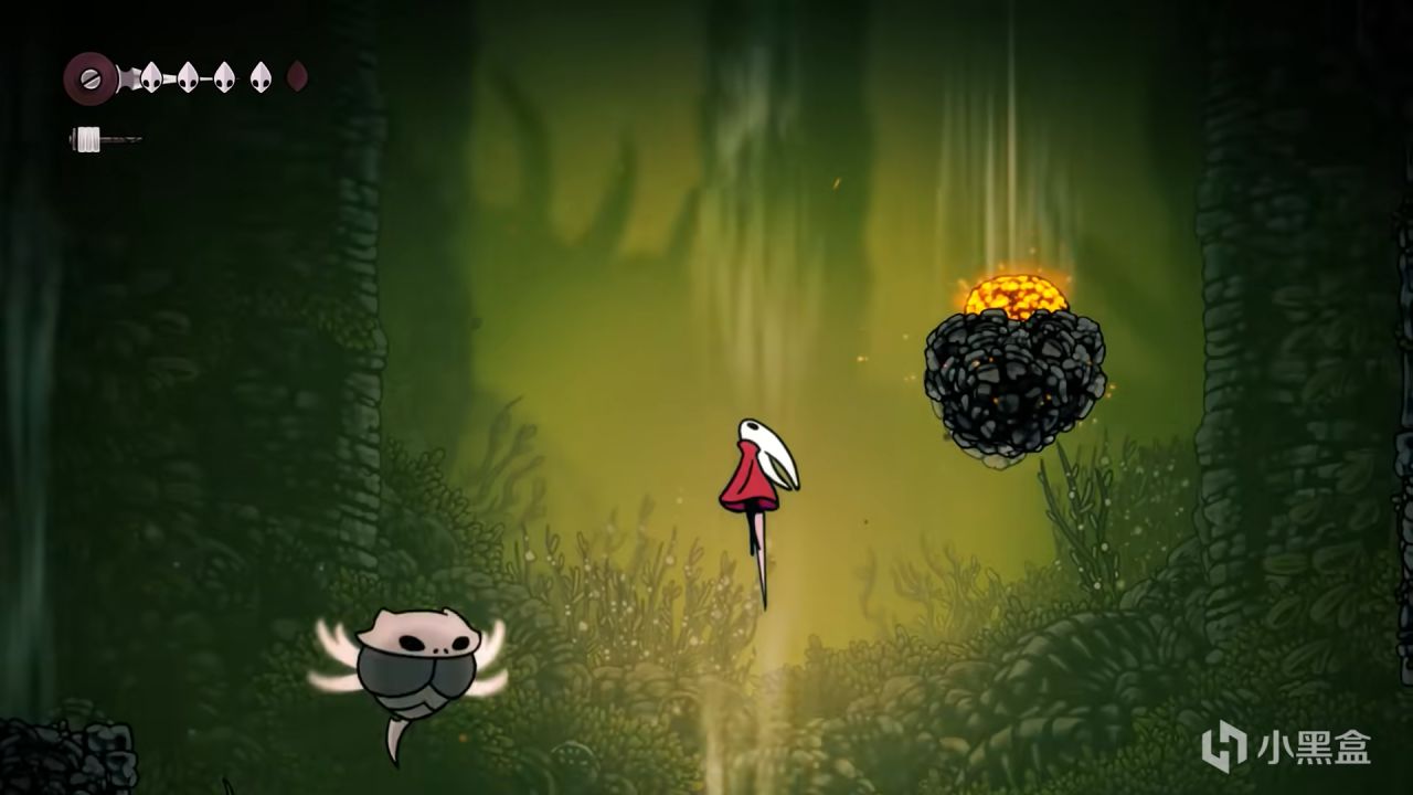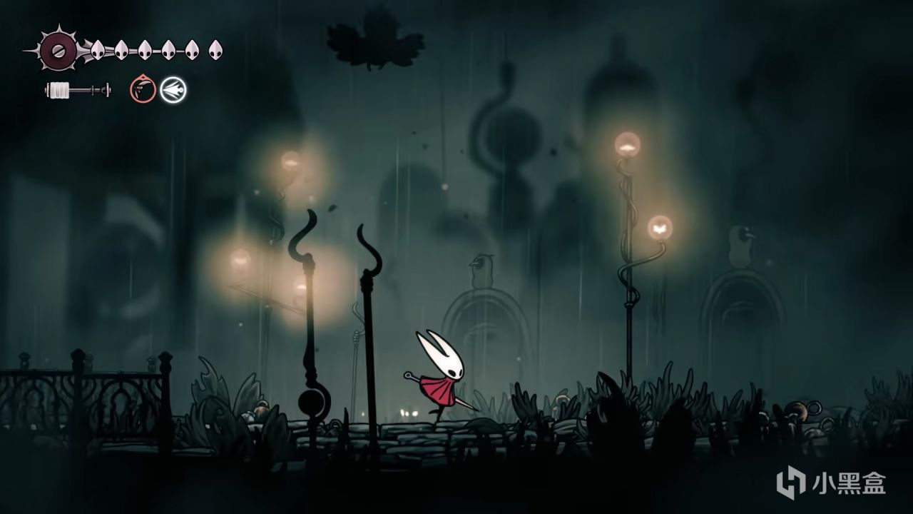 到下一個場景的過渡區域,可以看到地上的苔蘚以及草的種類是一樣的,走過去有很多小飛蟲飛過的動畫,也是第一次露出UI,有5滴血,前面的應該是低級地圖,很可能初始就有五滴血,跟空洞騎士是一樣的,但是魂槽變得不一樣了,魂槽下方還多了一條絲線值。