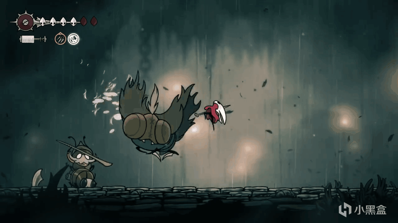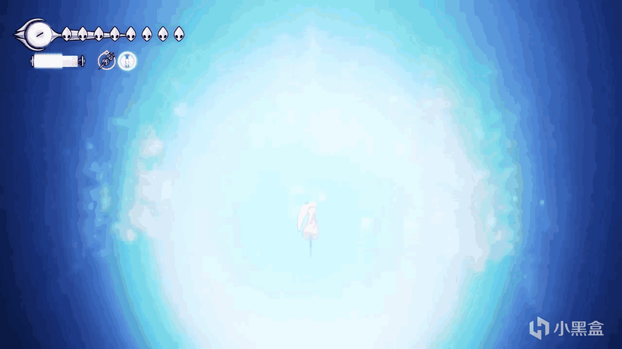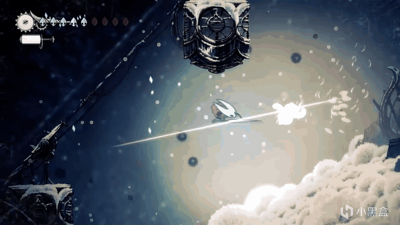 新區域,新敵人,可以看到蹬牆跳動作,仔細看了一下這個蹬牆跳的動作也跟空洞騎士不同,絲之歌是在牆上向上蹬,空洞騎士是斜向上蹬,這空中動作真流暢吧(不敢想苦痛之路會有多爽)。這個地圖應該是在雪原一類很冷的地方,看血量有不同的狀態。魂槽U又I不一樣了,看絲線槽右側一個技能也沒有,所以飛針應該是自帶的技能、被動能力一類的,魂槽好像變得只有一格了,釋放飛針技能直接耗空魂槽,加消耗一小格絲線值,飛針擊敗敵人回滿魂槽加回復兩小格絲線值。