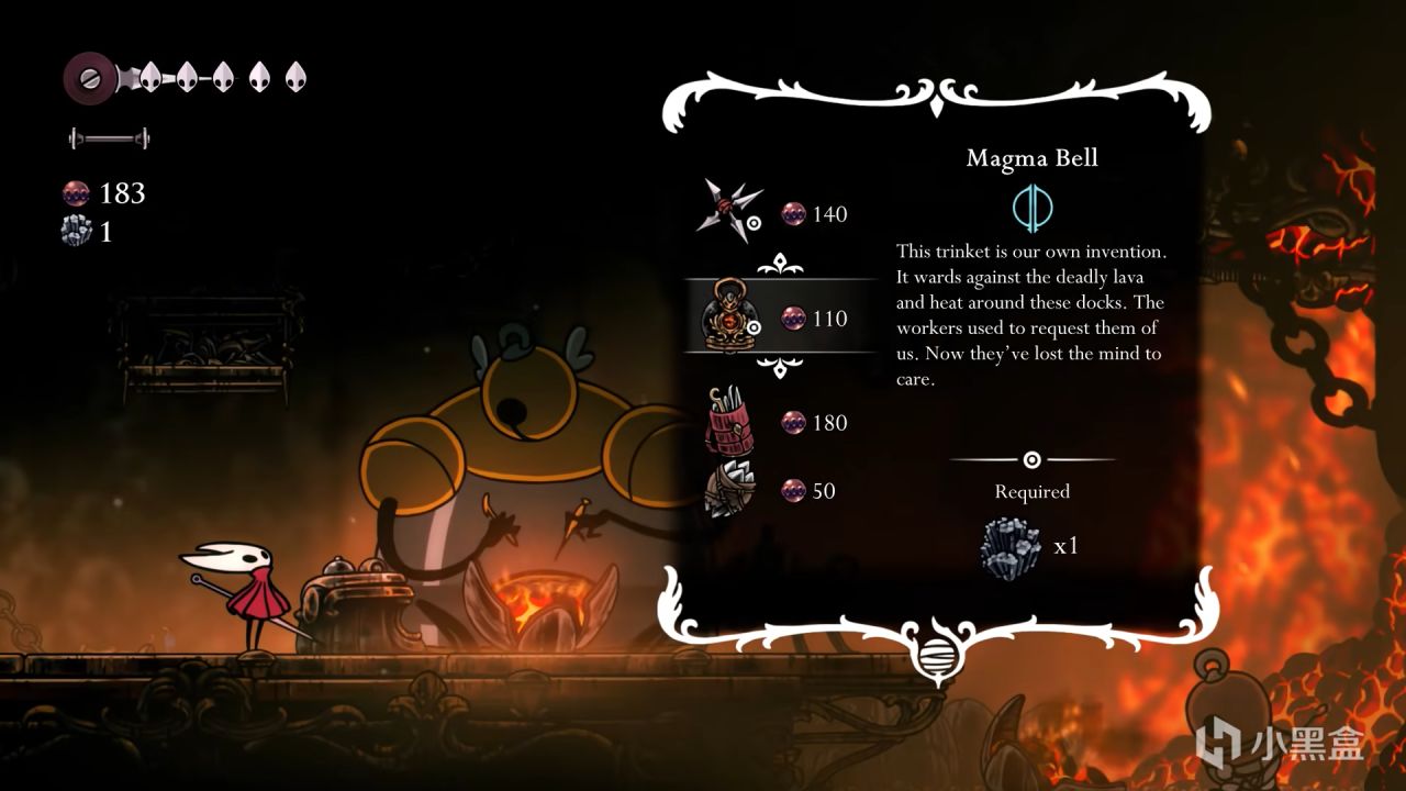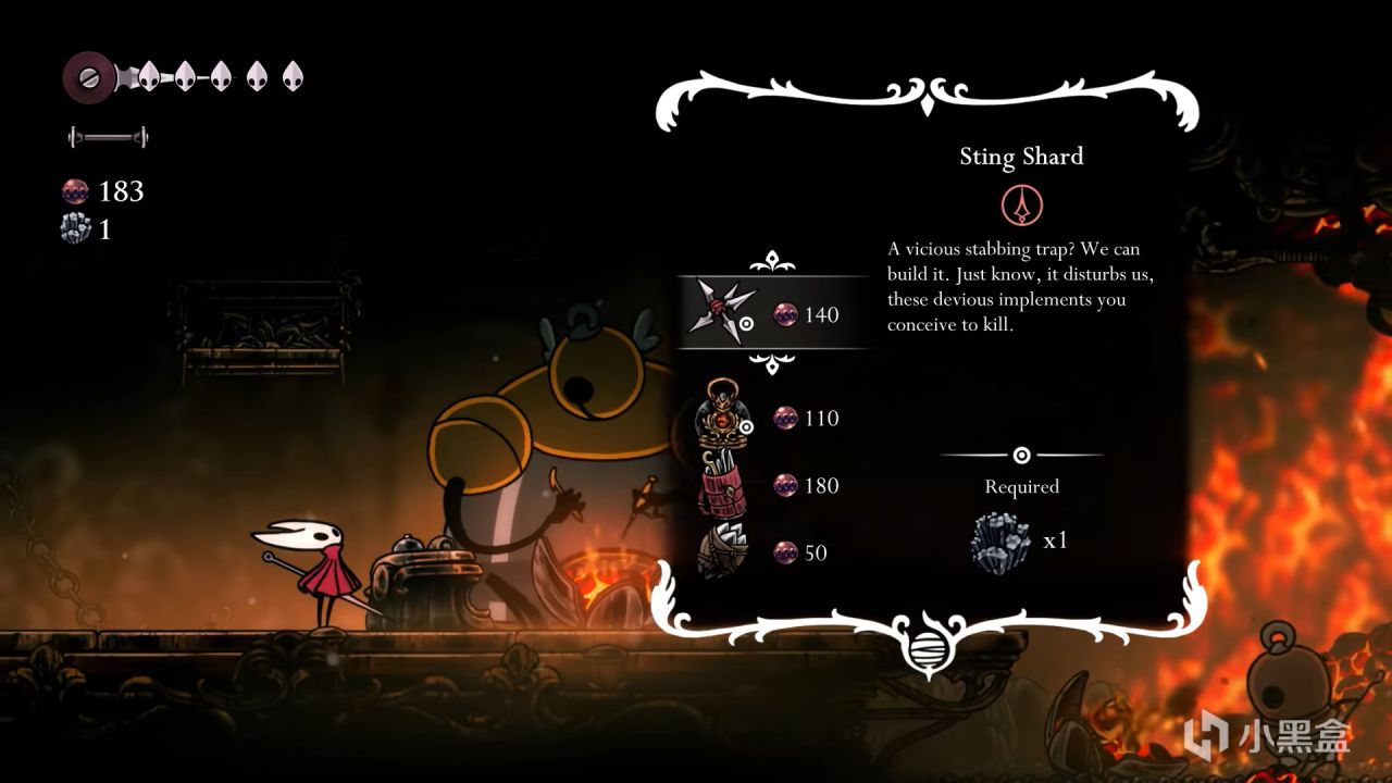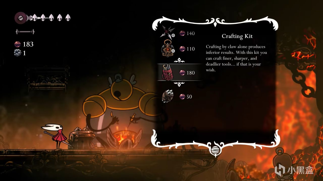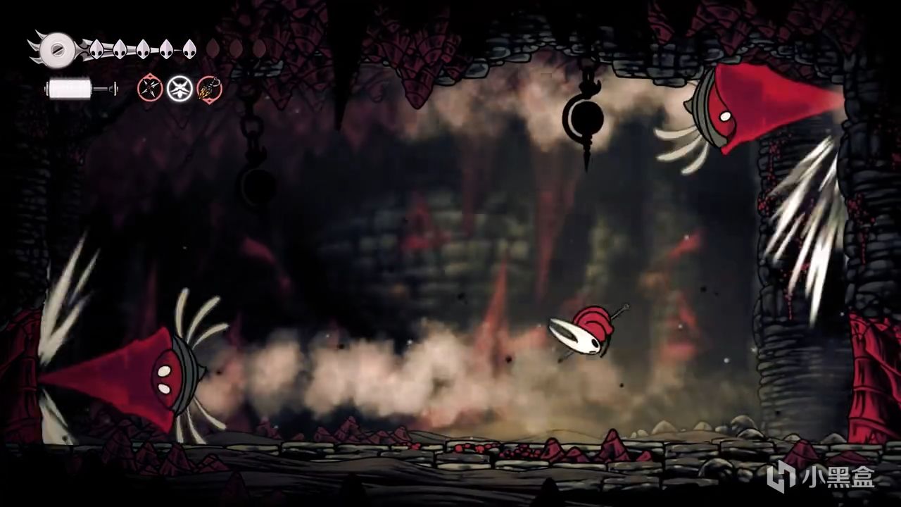 到達下一個區域,可以看到絲線值右側紅色技能不同了,很可能跟空洞騎士護符(太久沒玩,應該是叫護符吧)相似的系統,還有魂槽外圍的UI形狀也變了,應該是不同的武器或者攻擊模組之類的。
