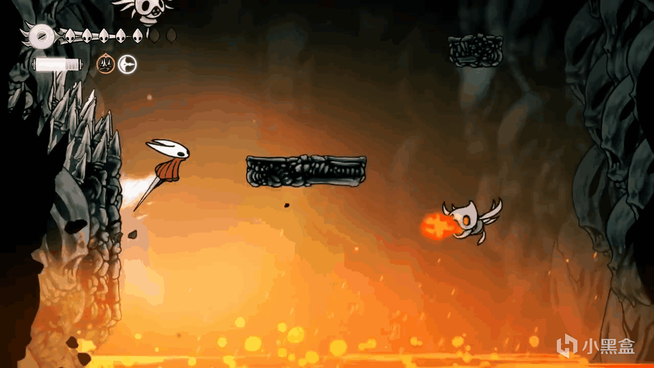 下一個區域,看背景是岩漿區域,出現了兩種新的敵人,也是一種在平臺上,一種會飛的,左側平臺出現了好幾次,之前苔蘚區域也有相似的平臺,右側中間平臺好像會動啊,應該是陷阱。