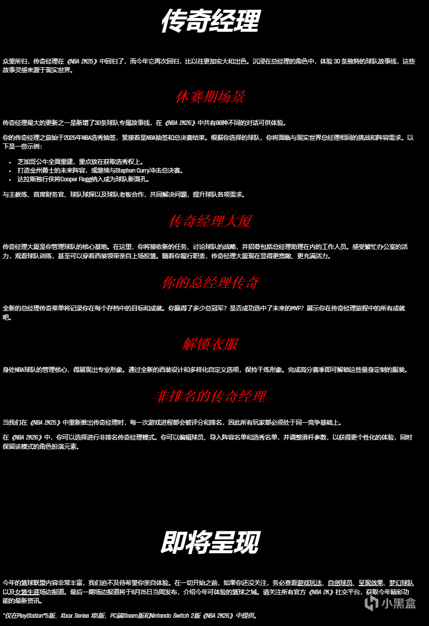 籃球聯盟和傳奇經理將在《NBA 2K26》迴歸,支持PlayStation®5、Xbox Series X|S、PC以及Nintendo Switch 2。遊戲加入了大量新內容和優化,讓這一無限制總經理體驗更加難忘且充滿成就感。
