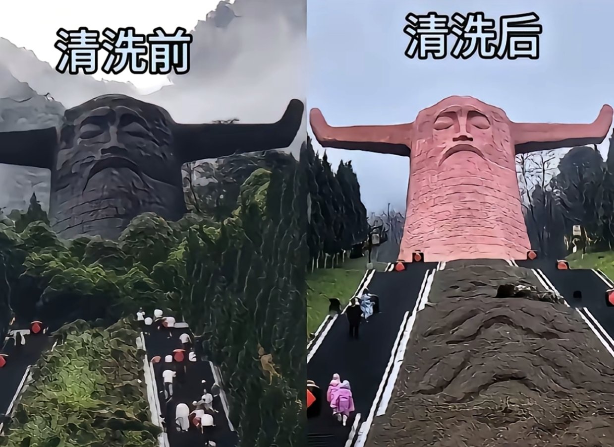 湖北神农架神农坛雕像🗿于 1997 年建成,其底漆是当时所刷,历经多年风吹日晒后,雕像出现掉色、变色现象,部分区域还长出了青苔 。
