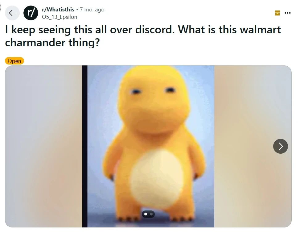已知的是,在7个月前,当奶龙在本土大杀四方时,老外基本没怎么听过这坨黄色的东西,虽然当时已经有少部分人在用这表情包了。那时还有老外在Reddit上问,他老是在Discord上看到的这个,像沃尔玛版的小火龙的东西是什么。