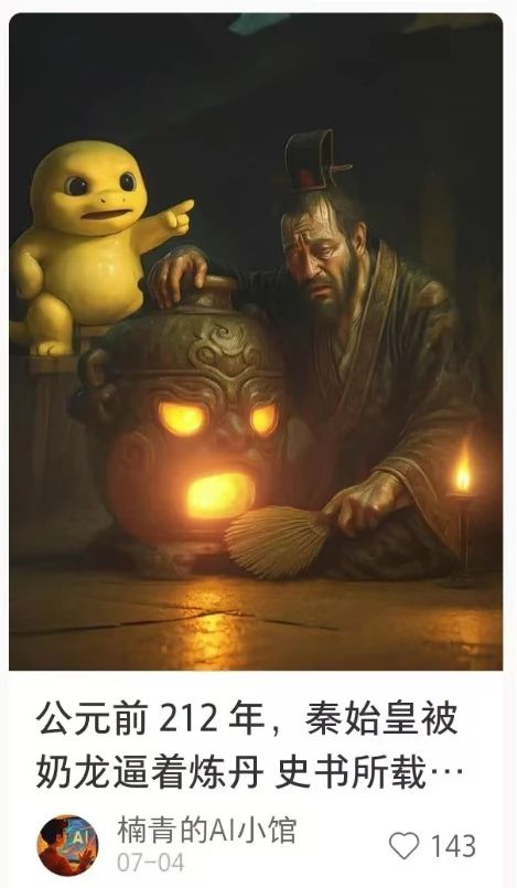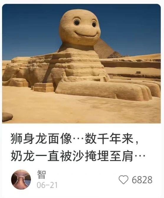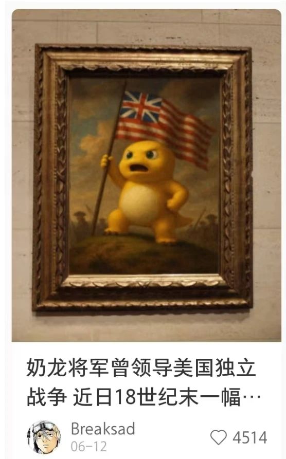 反观我们这边,奶龙依旧同时爆火于抽象和非抽象领域。小朋友们还是很喜欢奶龙动画,经常不语,只是一味向亲戚展示自己的奶龙玩偶。而大朋友们则让奶龙活跃在历史的每个重大瞬间,任何英豪或反派都可以披上奶龙的皮囊,任何电影与画作,都会在刹那间闪过奶龙的身影。终有一天,人类历史会如命定般变成一部奶龙的传记。