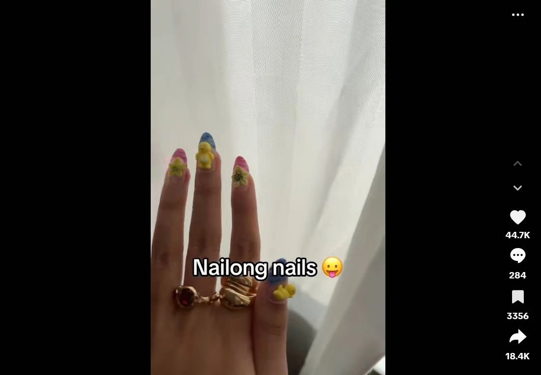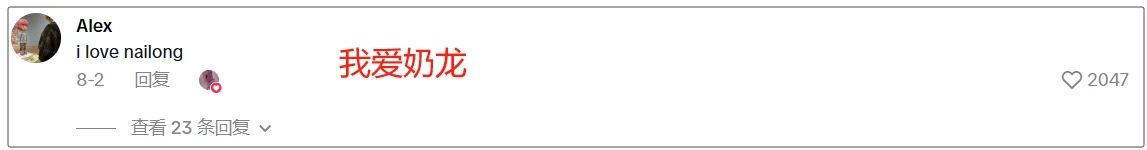 而且奶龙是在一个月内突然爆火的,就像某种忽然降临的启示。它在外网到底有多火呢?现在你只要去TikTok搜索一下“Nailong”或“Nai Loong”,就会看到一大堆几十万,甚至几百万点赞的视频,有时随便发个奶龙表情包的剪辑,都可能收获几千点赞。