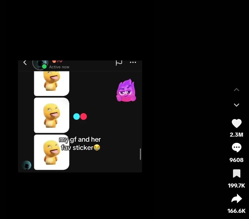 这视频引发的热潮,其实是归在TikTok一个名为“That One Gf Stickers”的话题下的。这话题有点难解释,直译是“那个女票的表情包”,其实是个有点宠溺、戏谑,也有点恋爱幻想的搞笑标签。你可以理解成“那个独一无二(魅力)女孩用的表情包”,如果一个漂亮的女孩,总是在暧昧期,给你发一些猎奇的陌生表情包,那它就能被收入这话题。