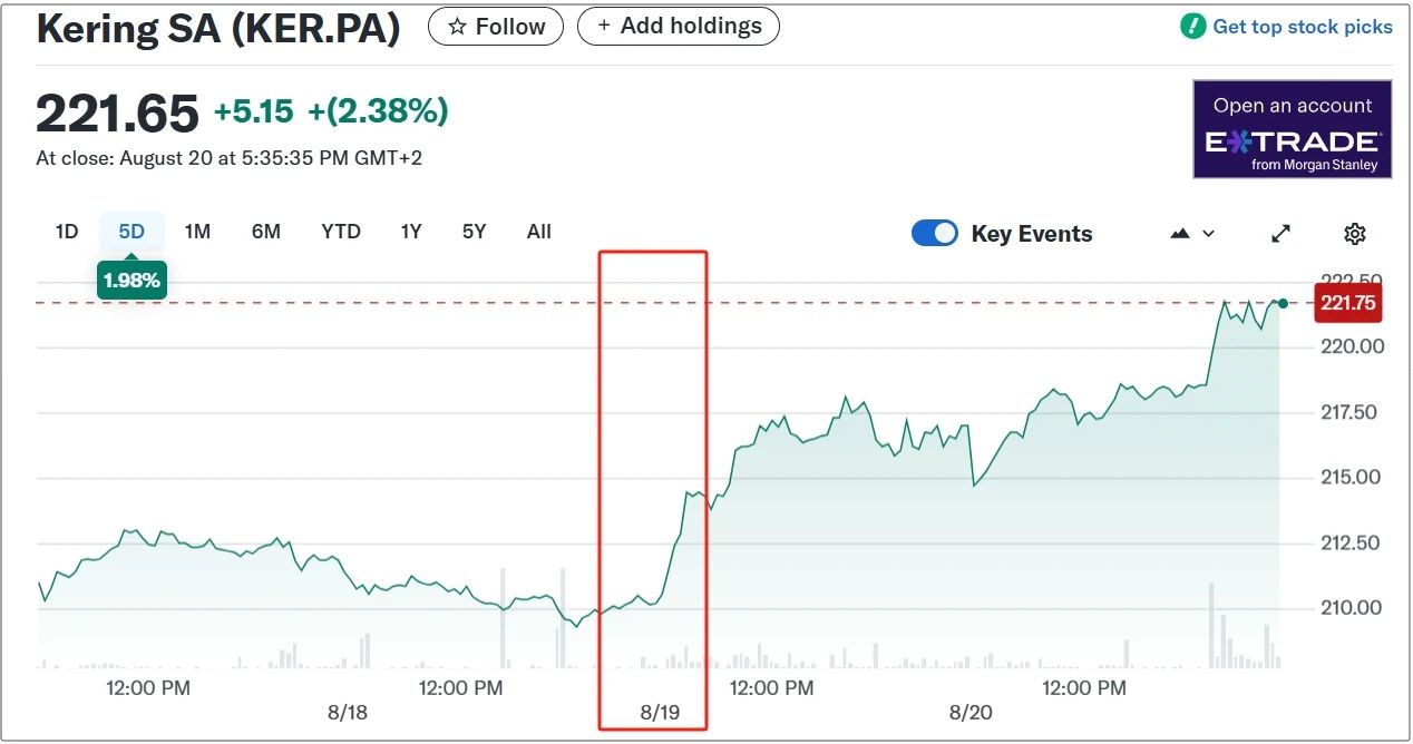 这梗原本有点无聊,直到奶龙引爆了舞池。没有任何奢侈品代言人,比阿黑颜的奶龙威力更强,Gucci背后的开云集团,也在这个时间点迎来了股价上涨,背后操盘手想必就是奶龙。