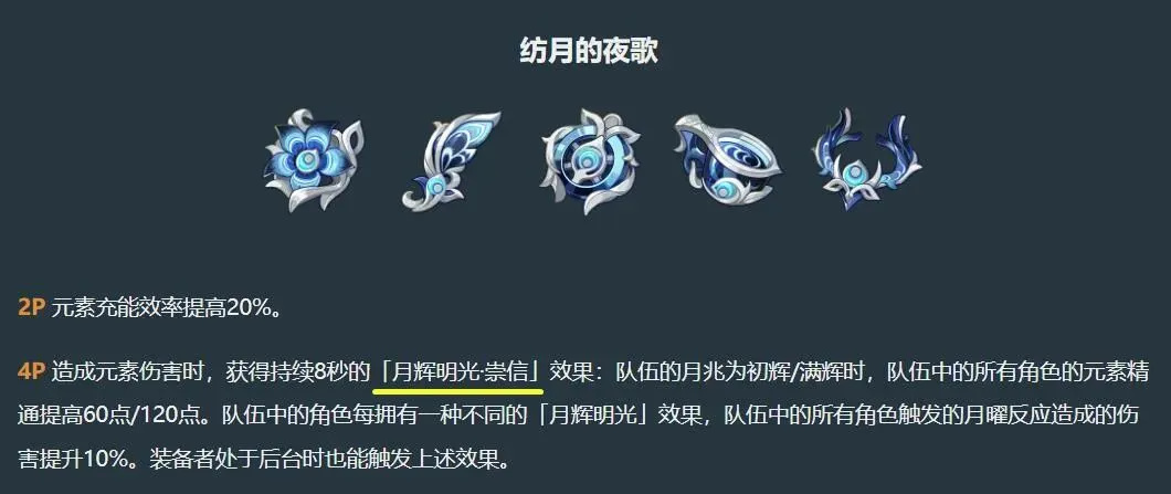 4件套:造成元素伤害时,提高全队元素精通和月曜反应伤害