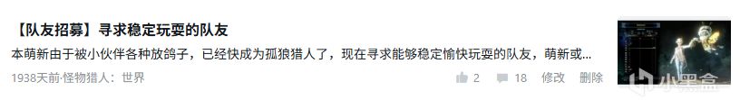 我最开始发的几个帖子,都是分享自己在MHW中的经历,以及想着找几个能稳定一起玩的队友(MHW我最后双端加起来玩了得有2100多小时)。