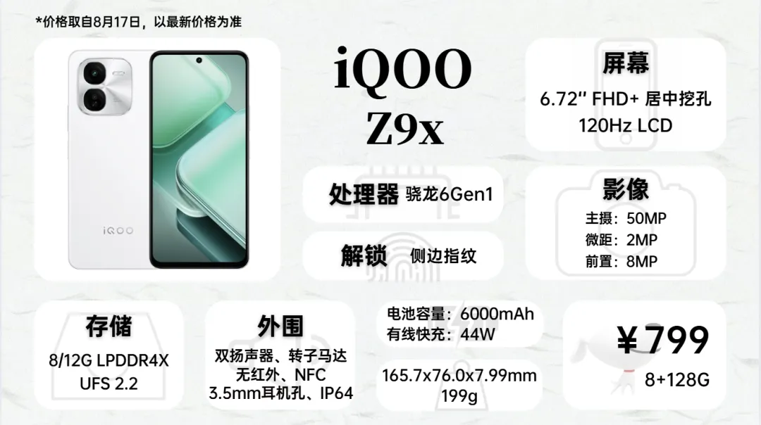 预算如果能到800-900多,我个人比较推荐iQOO Z9,采用一块华星C8材质的OLED直屏,屏幕素质不错,整体配置比Z10x高一些,骁龙7Gen3的性能也比6Gen1强一个档,外围配置非常到位,红外NFC X轴马达都有。