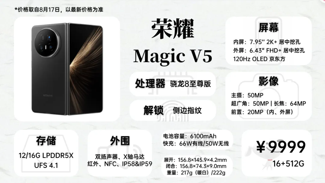 大折叠我个人推荐Magic V5,这款可以说是目前堆料比较猛的大折叠机型,骁龙8至尊、潜望长焦、无线充电、防水(防尘等级差点,但防水没问题)、无线充都给你安排上,重量和厚度控制也不错(217g,展开后4.1mm)。对比vivo X Fold 5,性能有优势;对比Find N5,重量和影像有优势。
