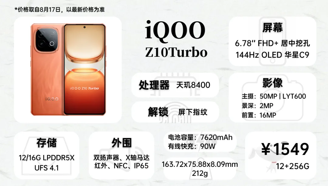 iQOO Z10Turbo走极致续航路线,天玑8400的高能耗比+7620mAh超大容量电池=续航王炸机型。它续航表现比上面两款机型要好一些,如果对续航要求特别高,优先考虑这款。但它砍掉了超广角镜头,大家选购时留意。