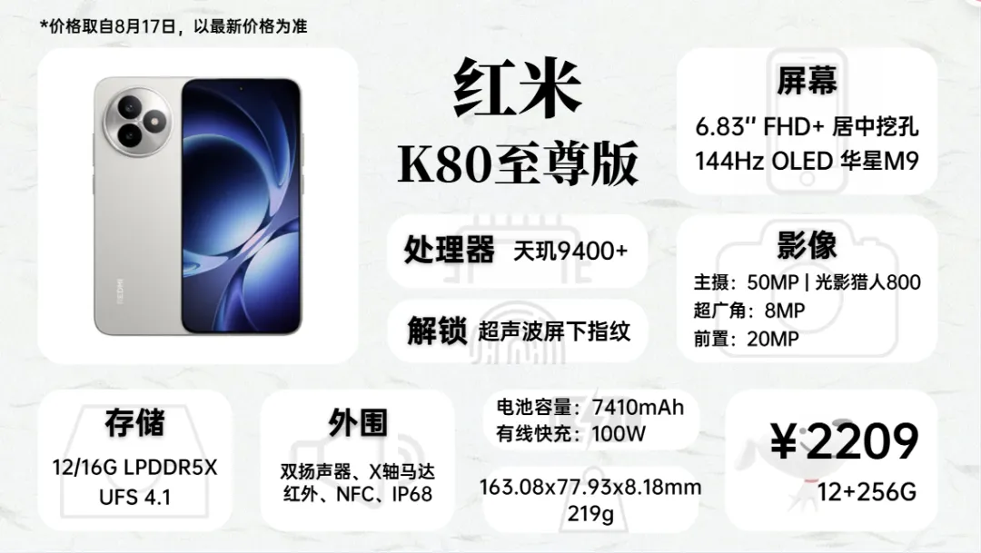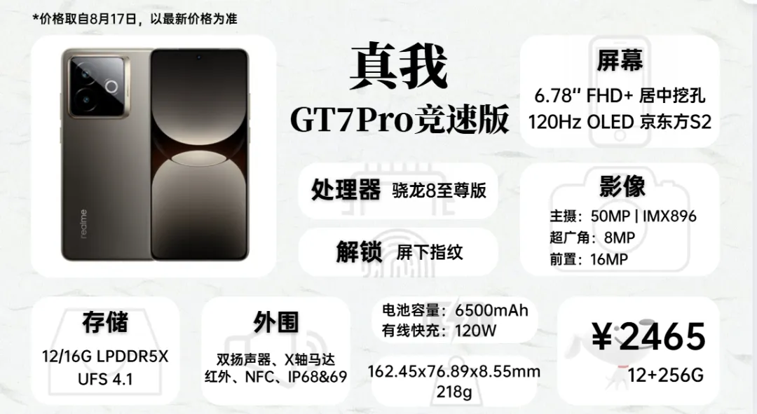 GT7涨到了2200多,该机型618期间最低有到过1989的价格,尽管如此,它还是目前价格比较低的天玑9400+机型,它采用塑料中框,质感上稍逊K80至尊一筹,但重量控制更好。